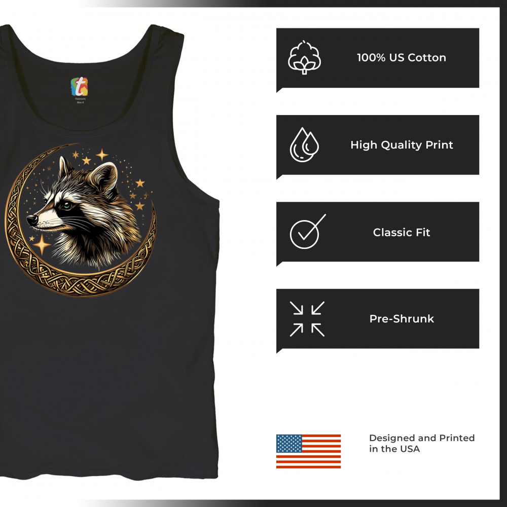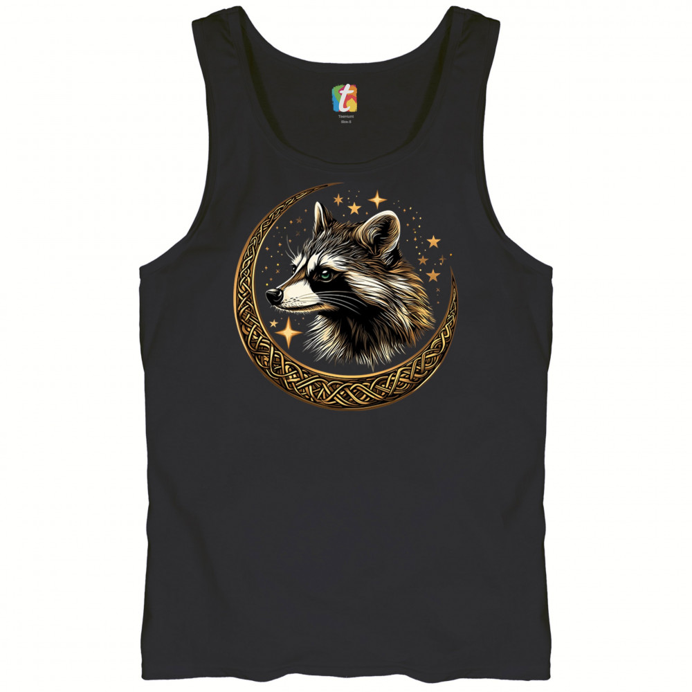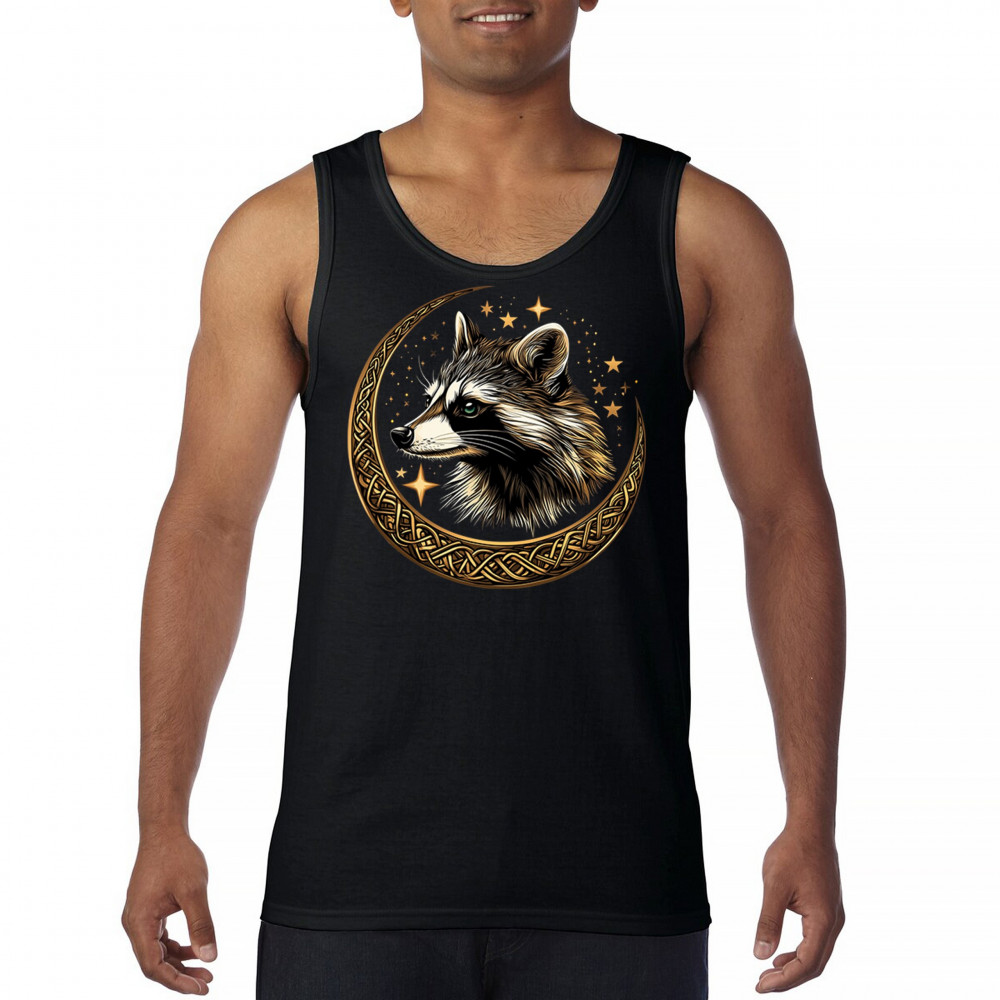 Cosmic raccoon design in Celtic moon. Symbol of adaptability, mystery, and spiritual intelligence. A perfect gift for wild and curious souls.