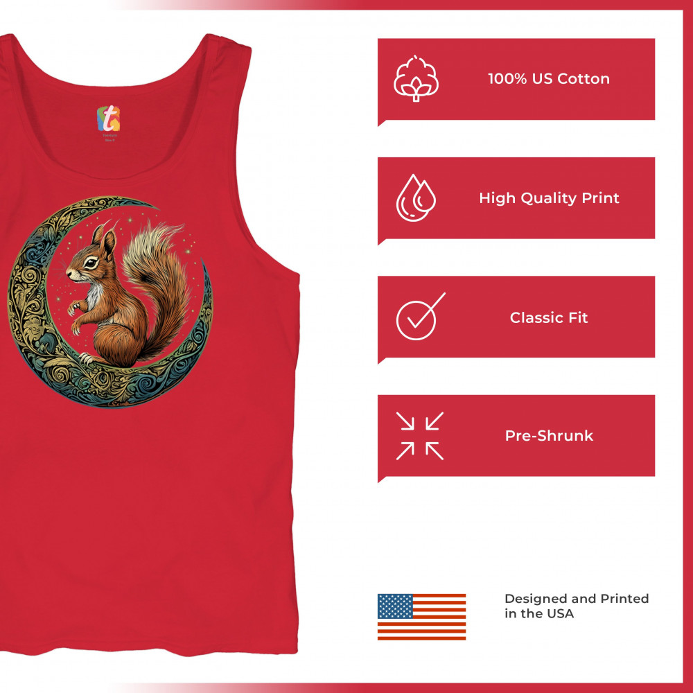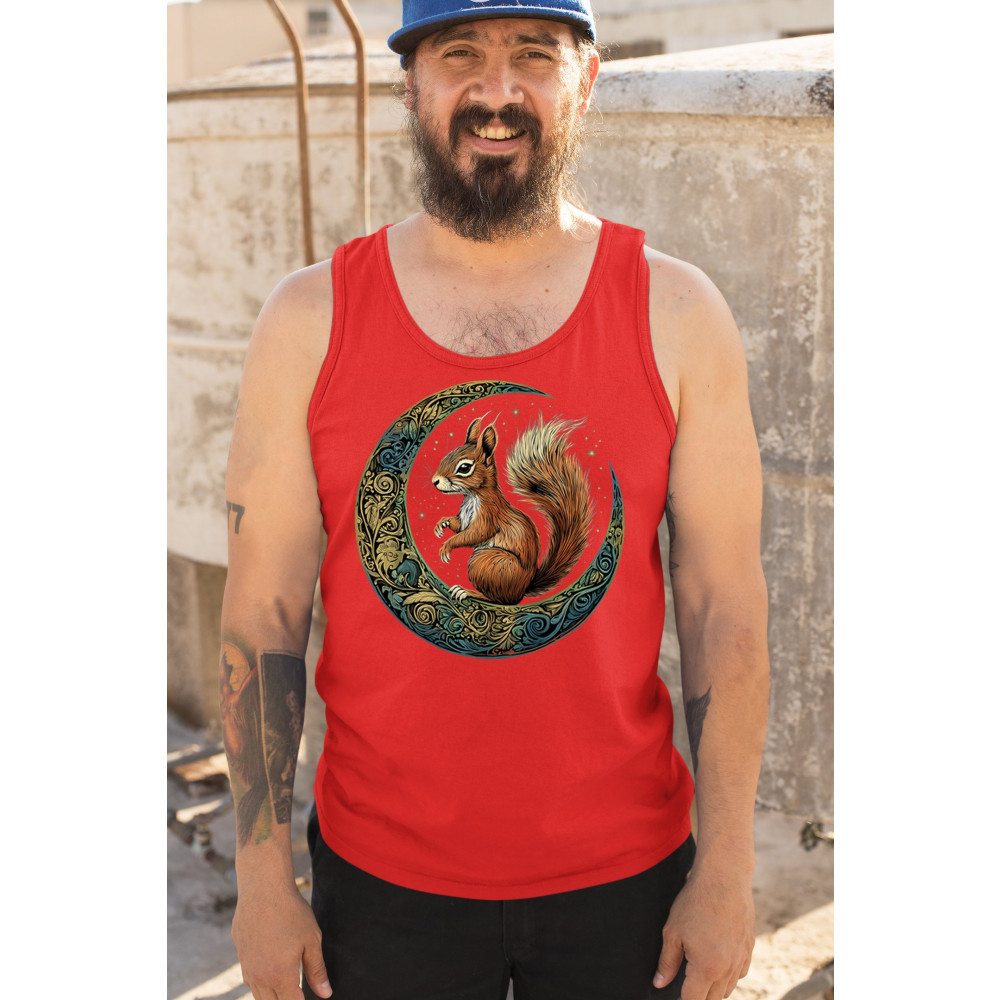 Red squirrel in green-gold Celtic crescent moon with cosmic sky. Symbolizes agility, planning, and mystical forest energy in a fantasy design.