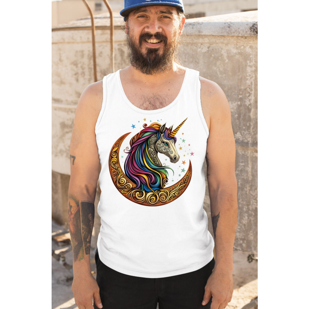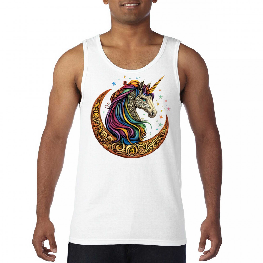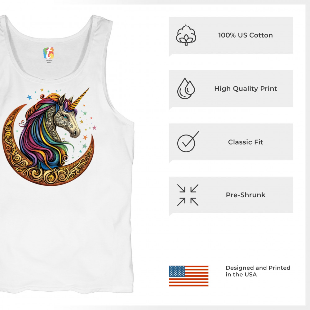 Rainbow-maned unicorn in golden Celtic moon design—perfect for fantasy lovers, dreamers, and unicorn fans who believe in magic and spirit.