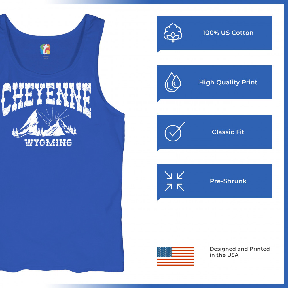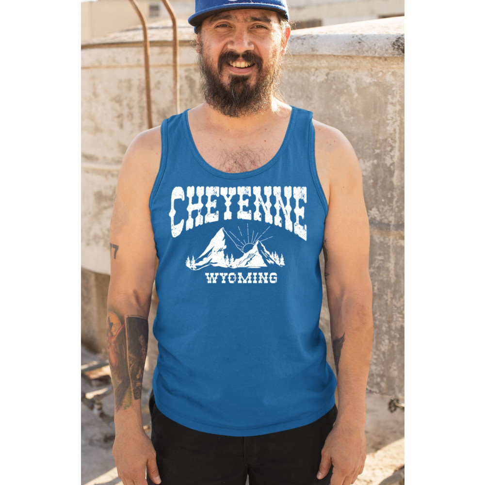 Vintage Cheyenne Wyoming design with mountain sunrise for outdoor lovers and locals. Perfect for travel, hiking, or Western pride.