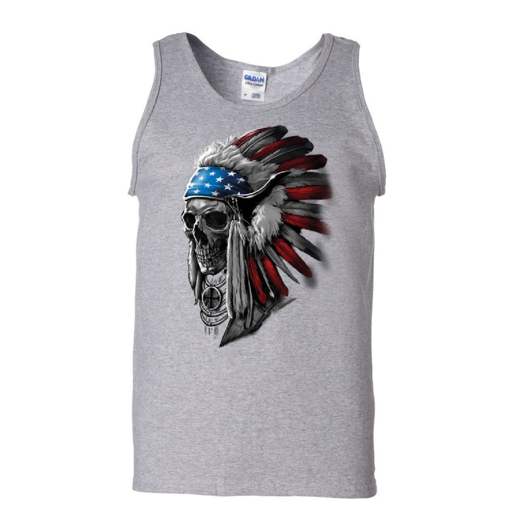 CHIEF SKULL HEADRESS tank top native american stars and stripes sleeveless gray