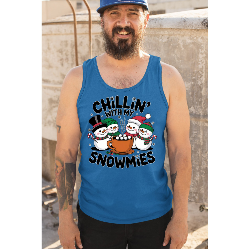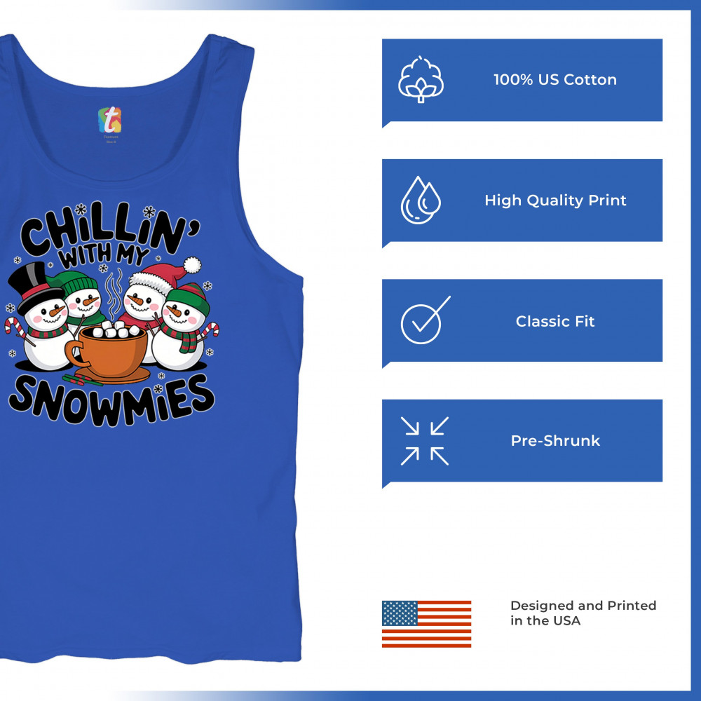 A cute and cheerful winter design showing happy snowmen sharing hot cocoa, perfect for Christmas gatherings, holiday events, seasonal photos, white-elephant gifting, festive family nights, winter celebrations, cozy weekend vibes, and fans of playful holiday humor. A fun graphic for anyone who loves bright and friendly Christmas styles.