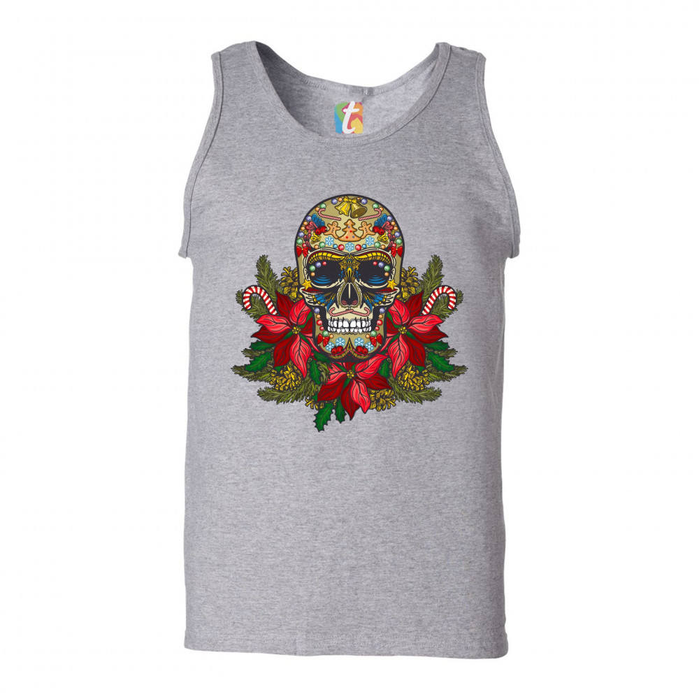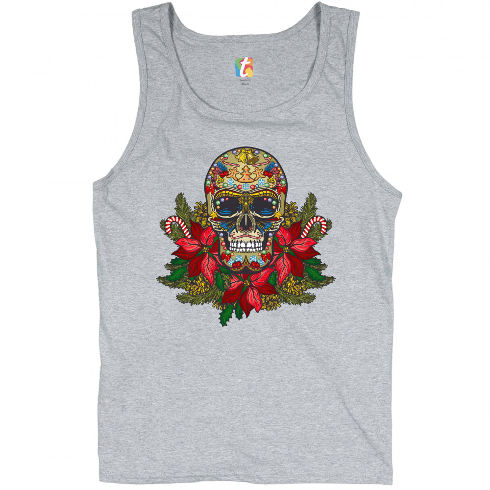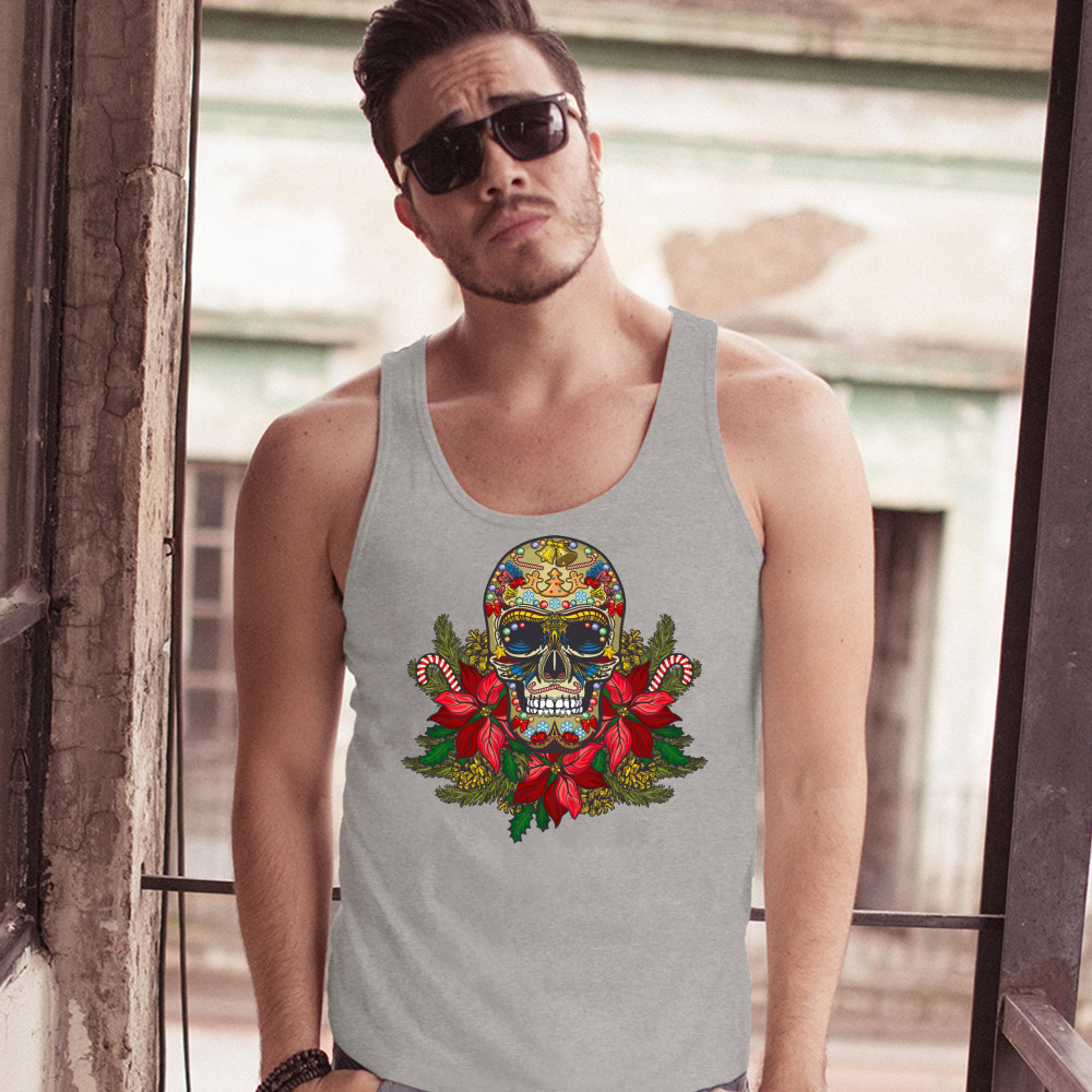 A print featuring a gorgeous sugar skull sitting atop of mistletoe. The skull is decorated with bells, candy canes and gingerbread men dancing around a Christmas tree on the forehead. It has candy canes instead of mustaches and wings underneath the eye so