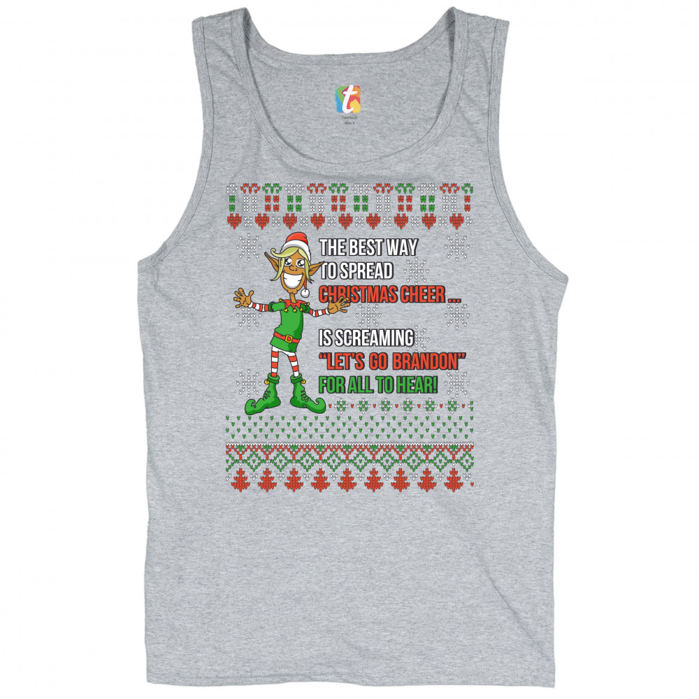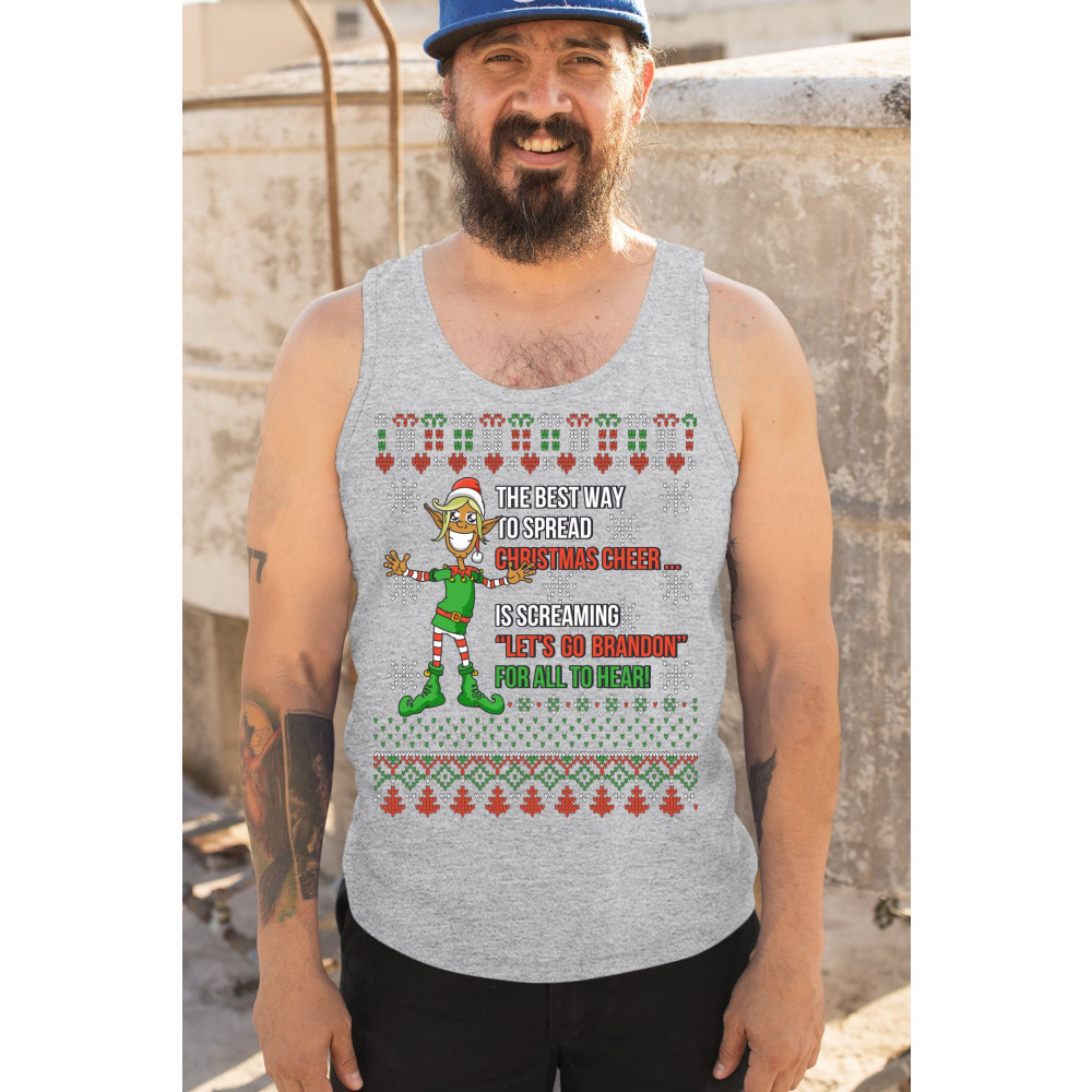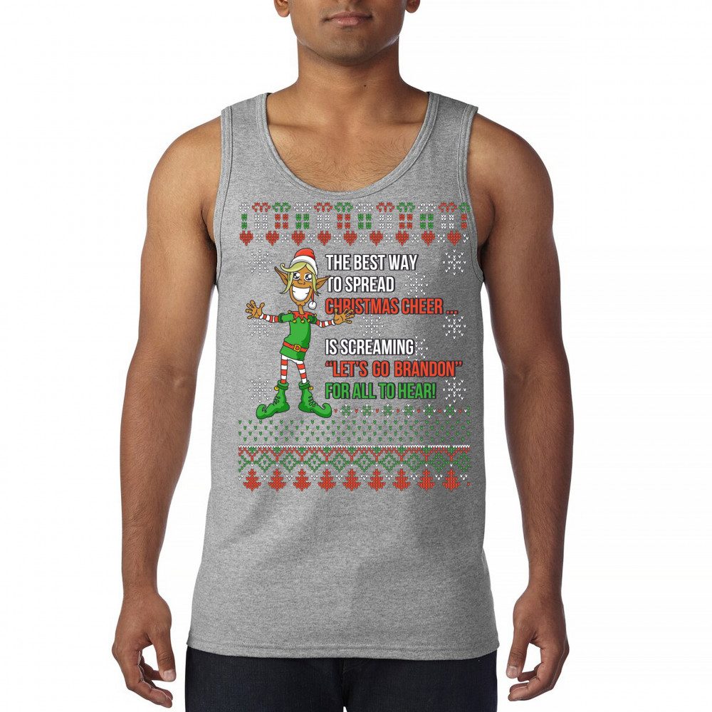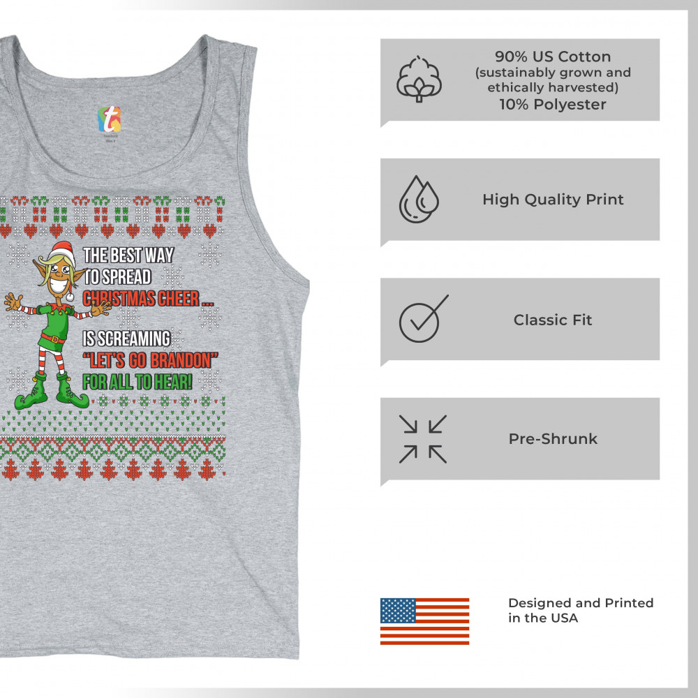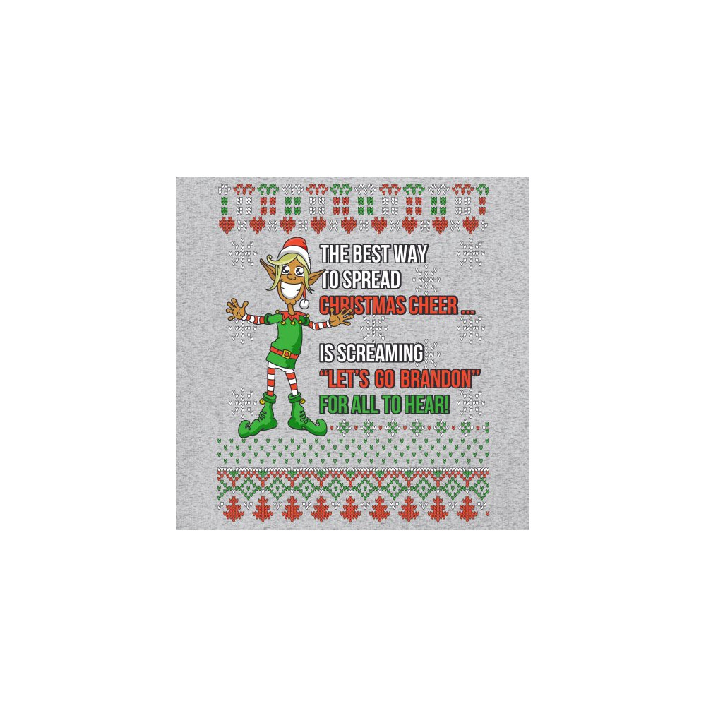 A funny print saying: "The Best Way to Spread Christmas Cheer Is Screaming Let's Go Brandon for All to Hear" and featuring a smiling elf. The print is decorated as a Christmas ugly Sweater. A great choice to wear for a Christmas or New Year's Eve party an