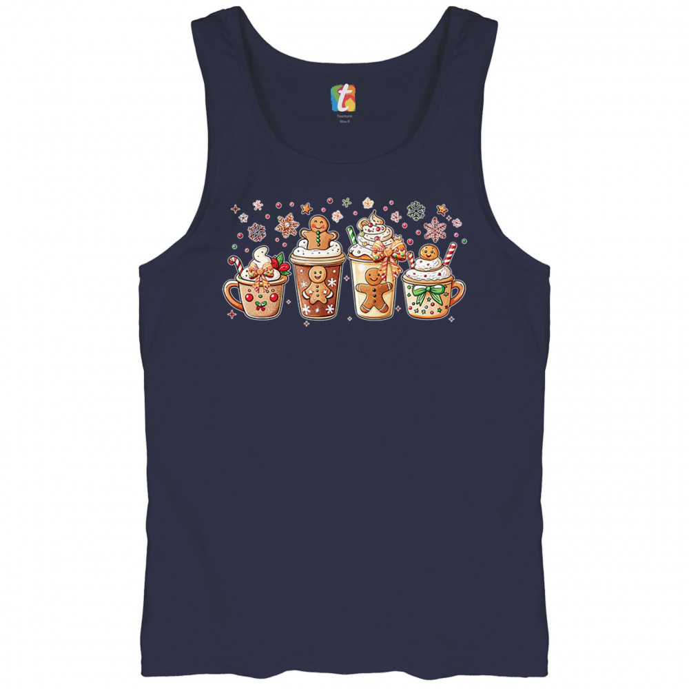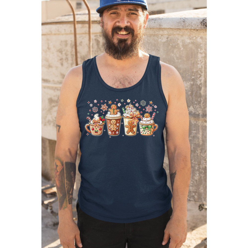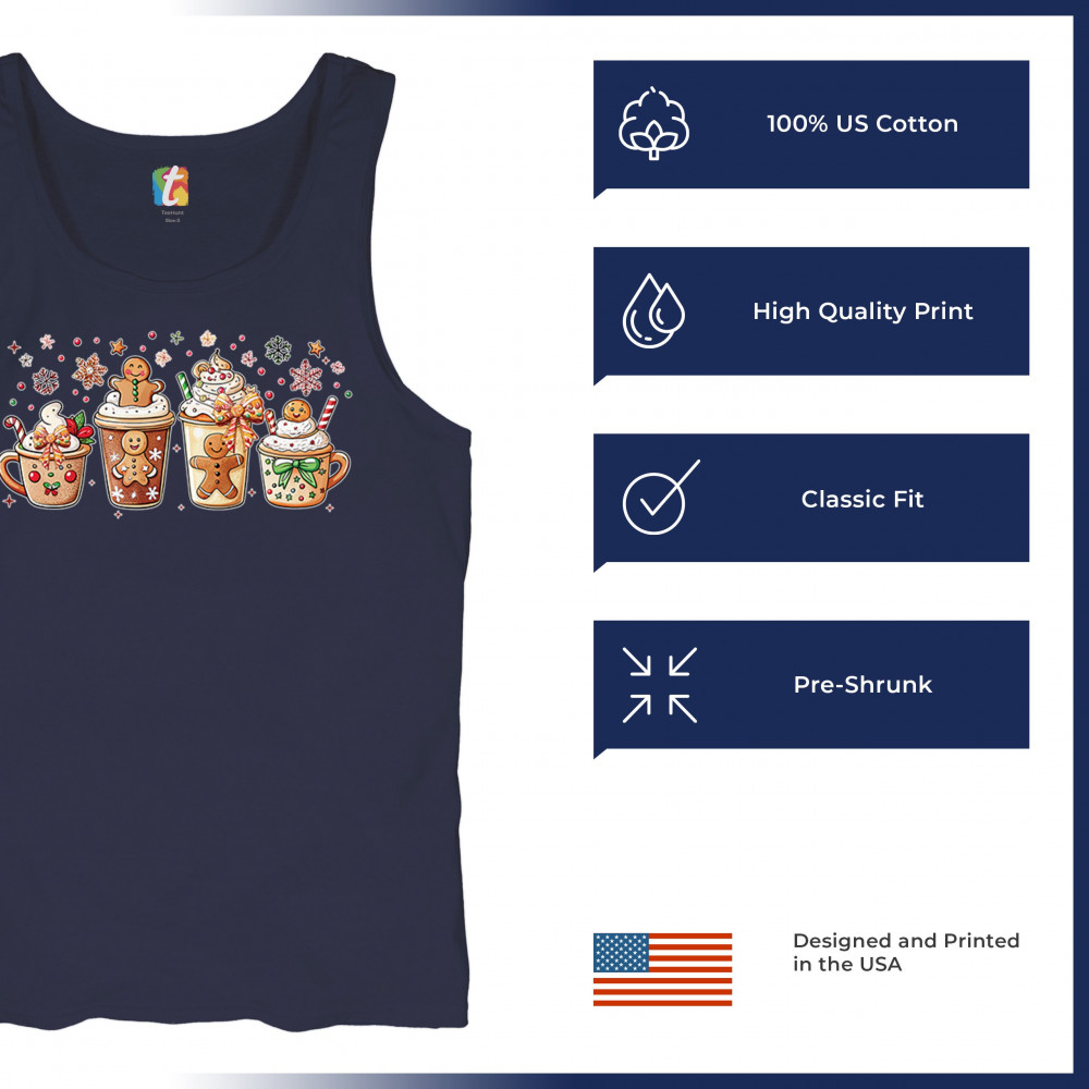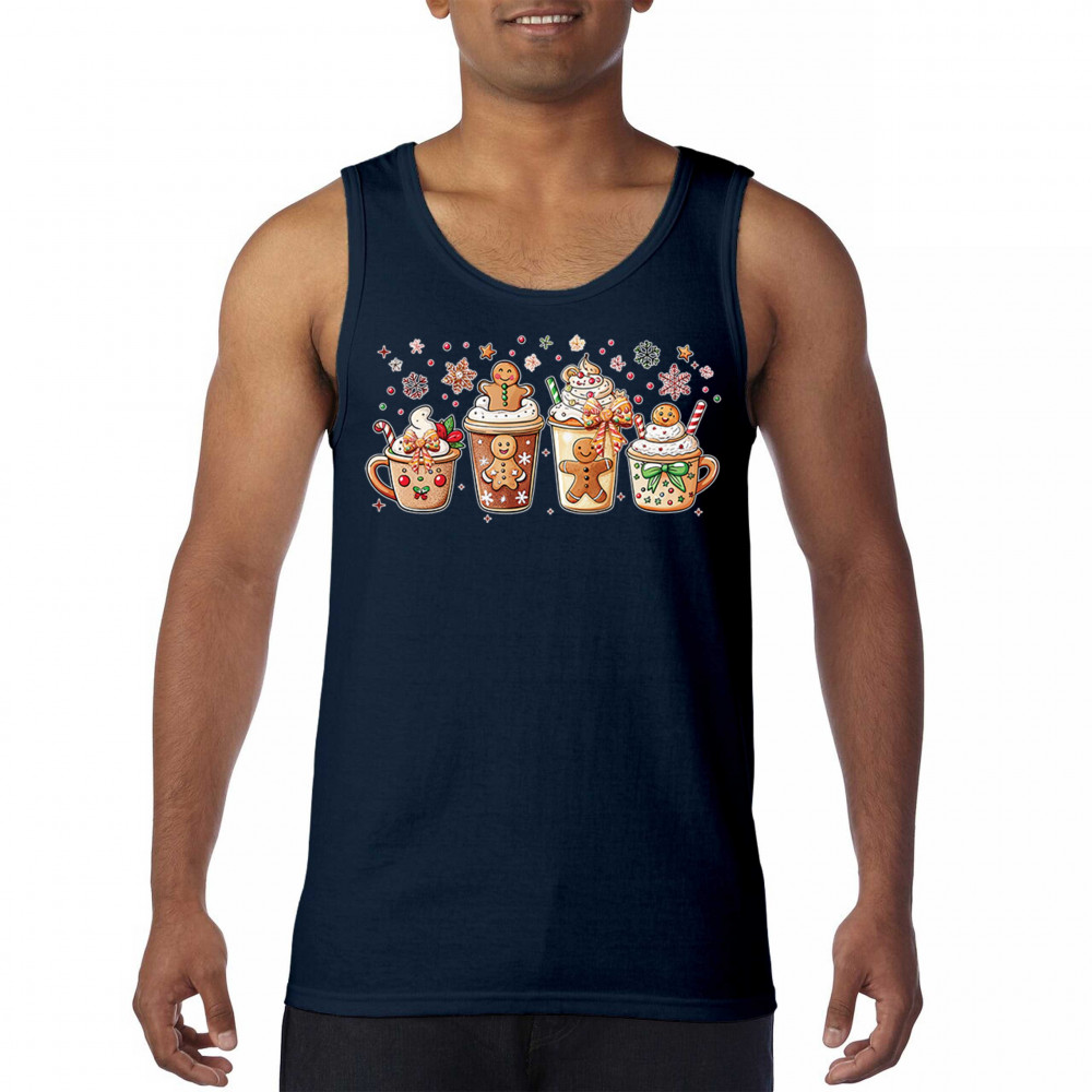 This cute Christmas drink design showcases gingerbread mugs, whipped cream, candy canes, sprinkles, and festive decorations for a warm winter aesthetic. Perfect for cocoa lovers, coffee fans, bakers, cozy holiday nights, gift exchanges, Christmas morning vibes, seasonal parties, and anyone who loves adorable dessert-inspired holiday art.