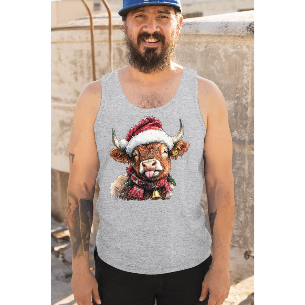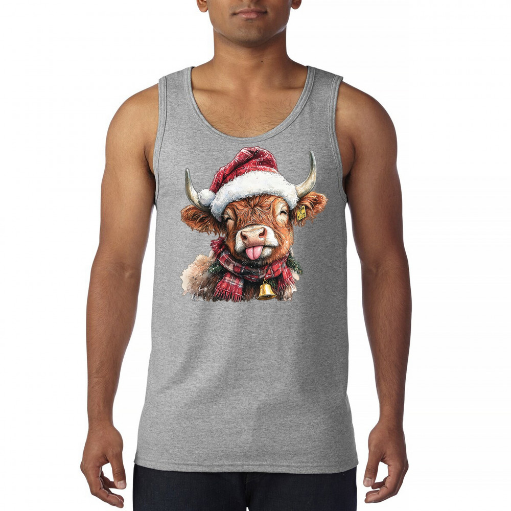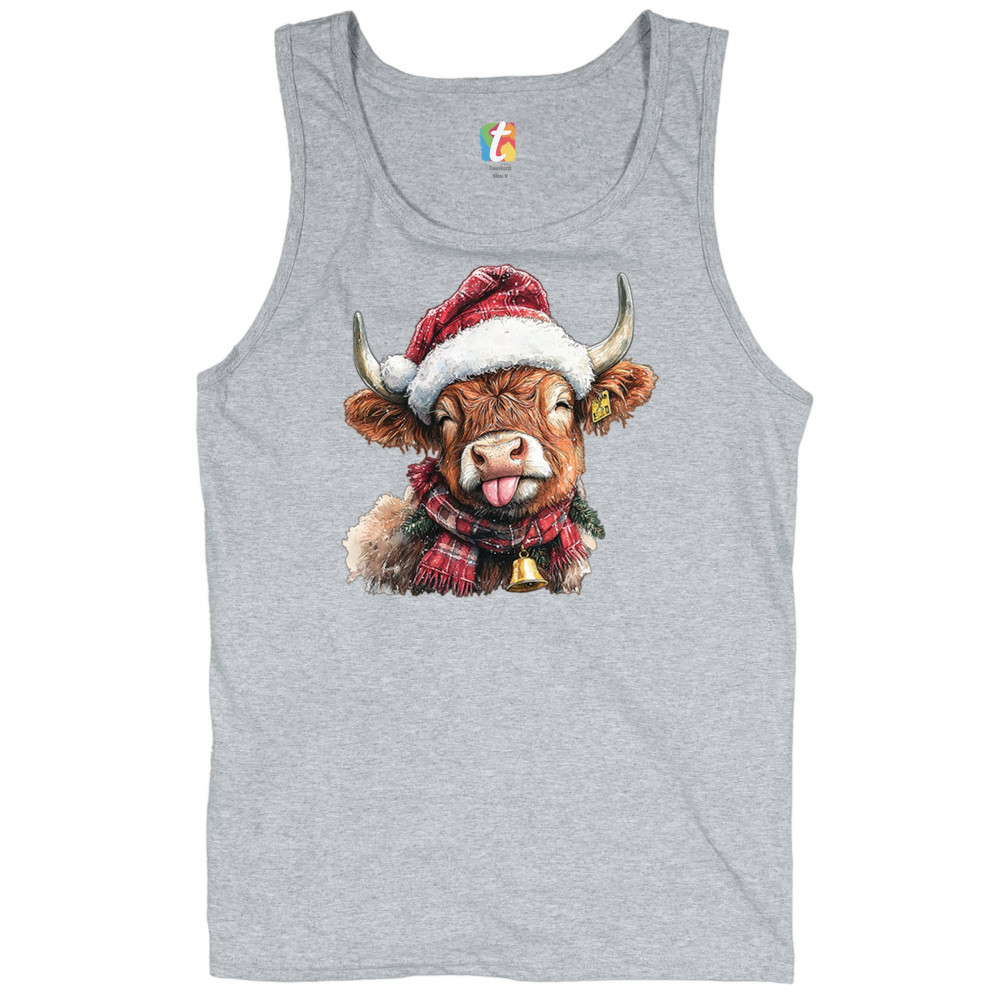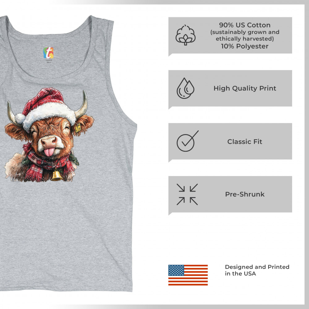 Christmas Highland Cow shirt – rustic holiday design with Santa hat cow, farmhouse holiday humor, country Christmas vibes, and festive livestock art.