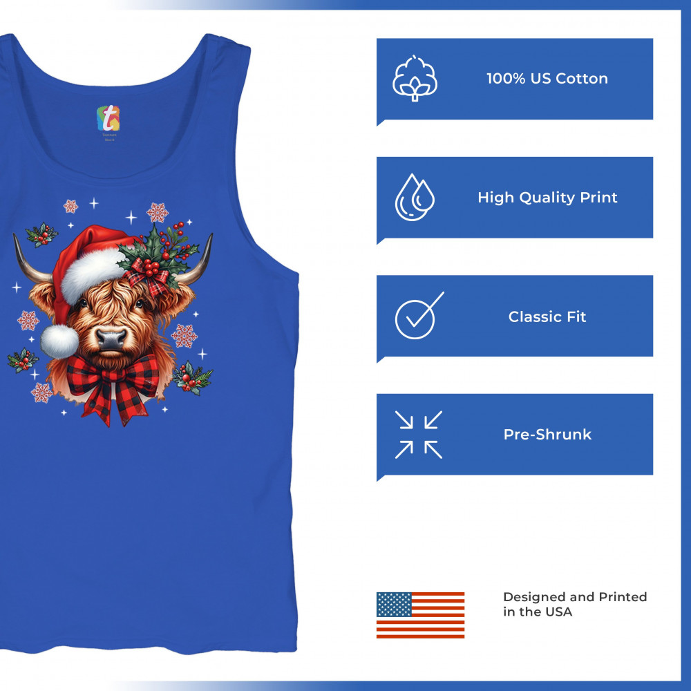 Festive Highland cow Christmas design with Santa hat, plaid bow, holly, and rustic farmhouse holiday charm. Perfect for cozy winter decor.