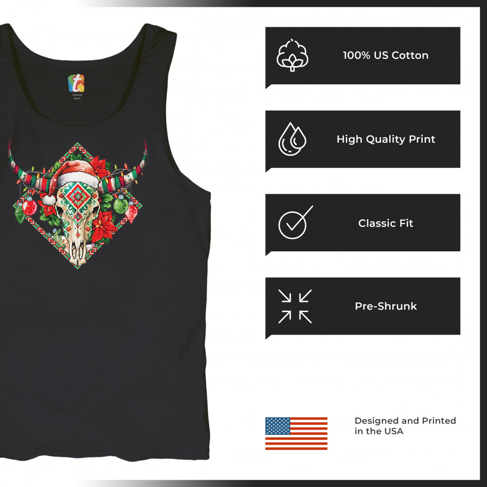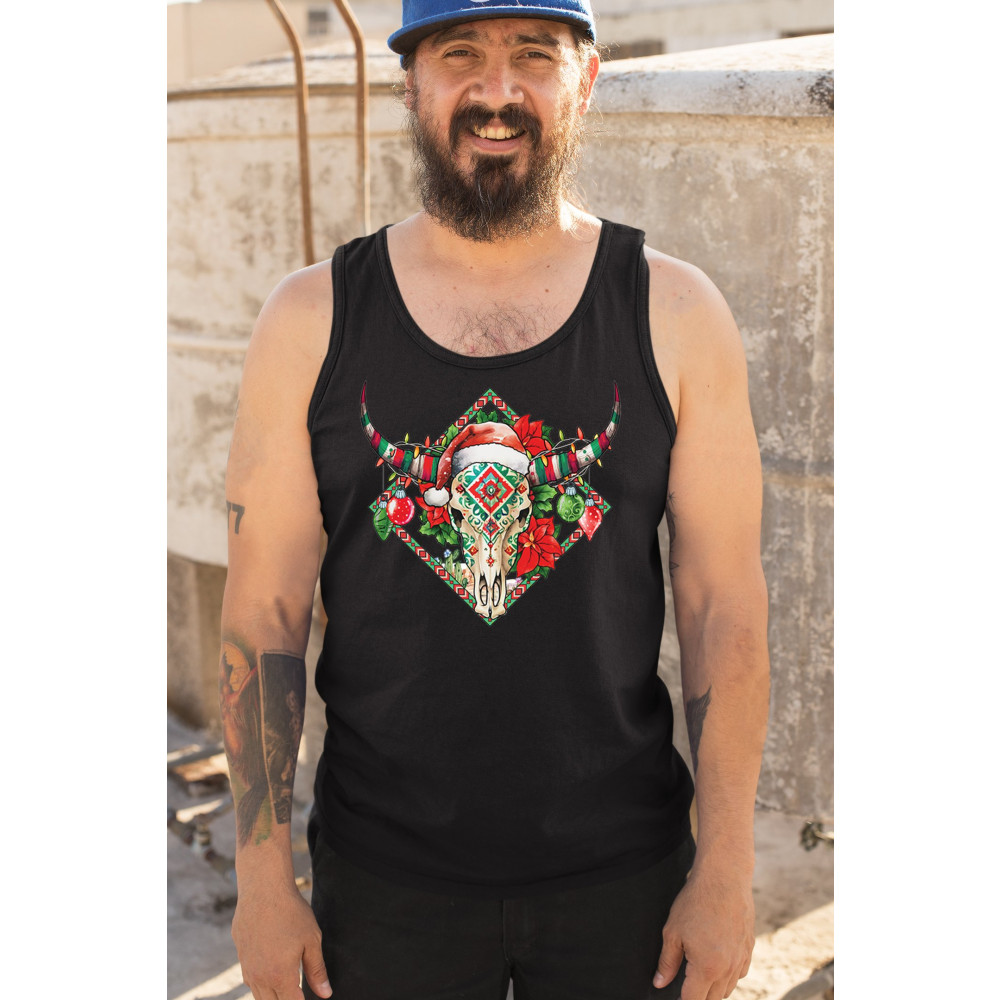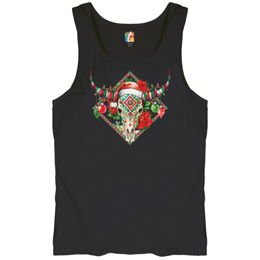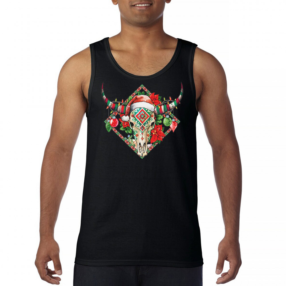 CHRISTMAS STEER SKULL tank top festive santa hat native american men's top black