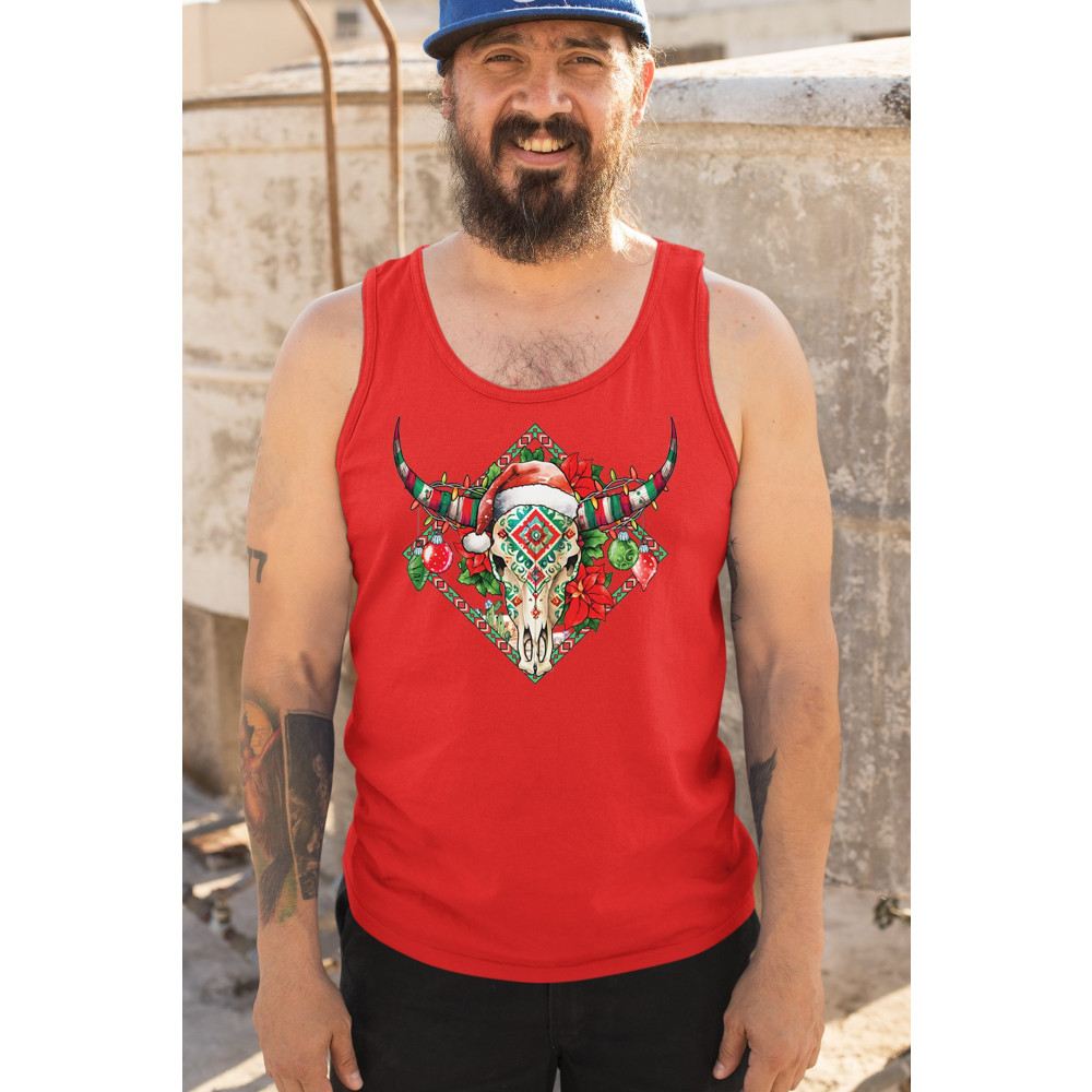 Blend Southwestern charm with holiday cheer! This vibrant skull design with poinsettias and ornaments is perfect for festive parties and unique gifts!