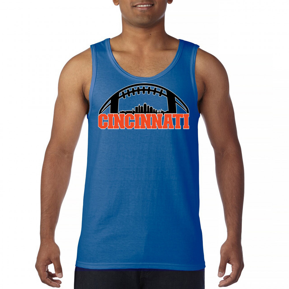 Celebrate Cincinnati and football with this bold skyline design under a football arch. Perfect for fans, tailgates, and game days!