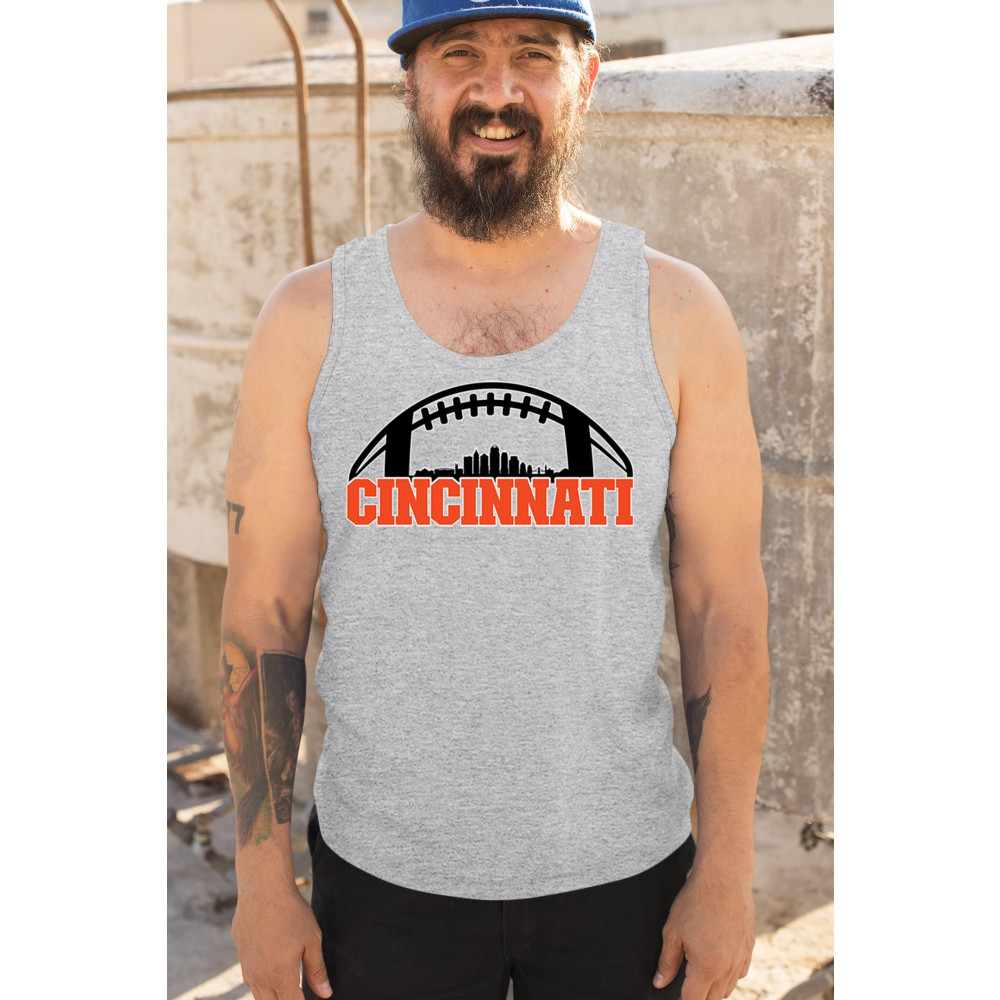 Celebrate Cincinnati and football with this bold skyline design under a football arch. Perfect for fans, tailgates, and game days!
