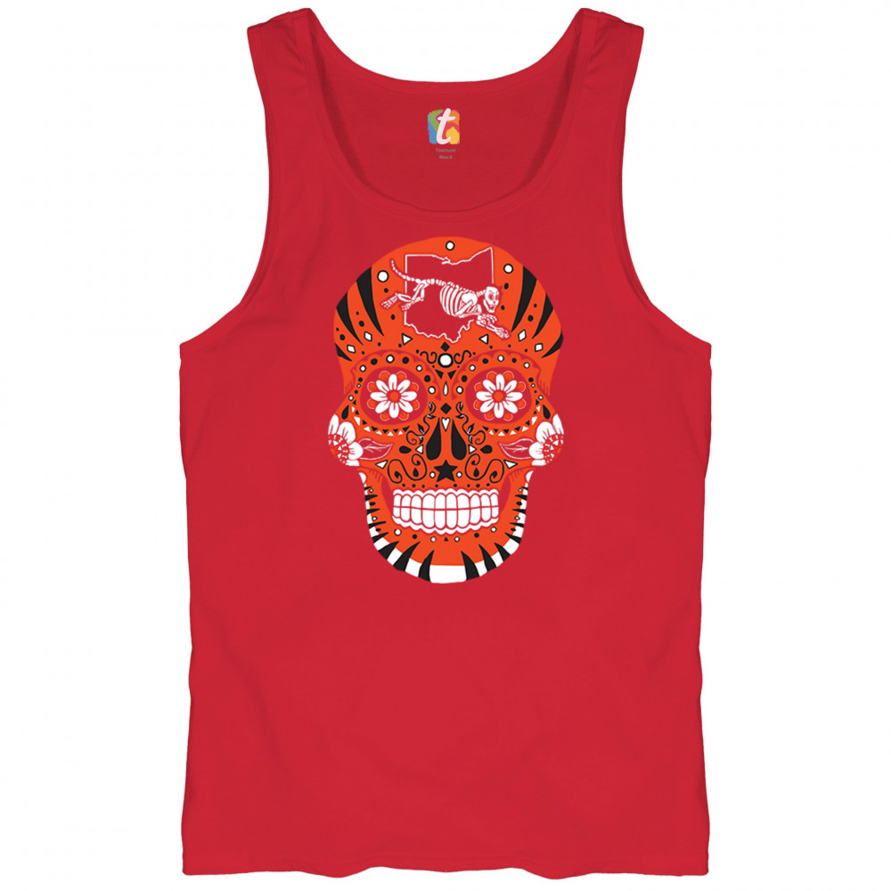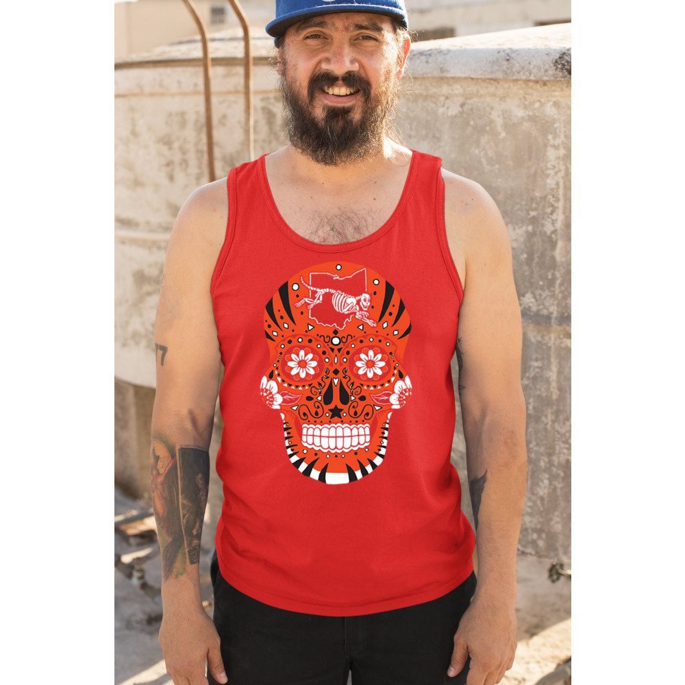 Cinci Sugar Skull with Queen City Paw, underdog grit, black & orange pride, Game Day energy, and playoff vibes.
