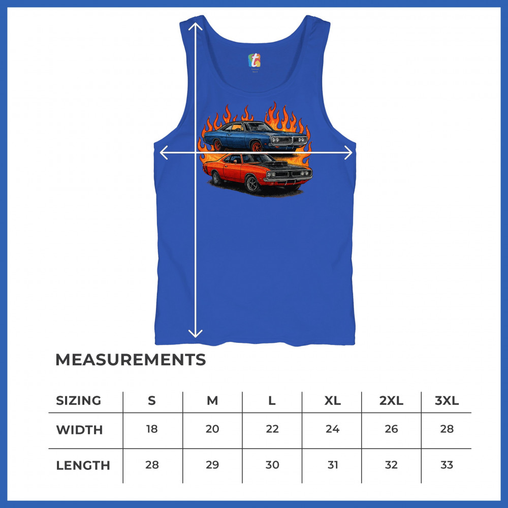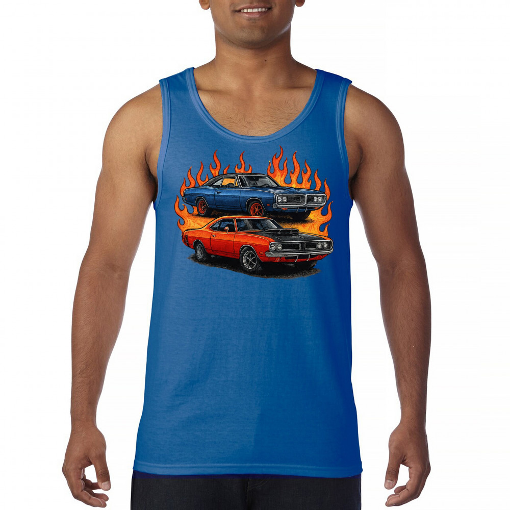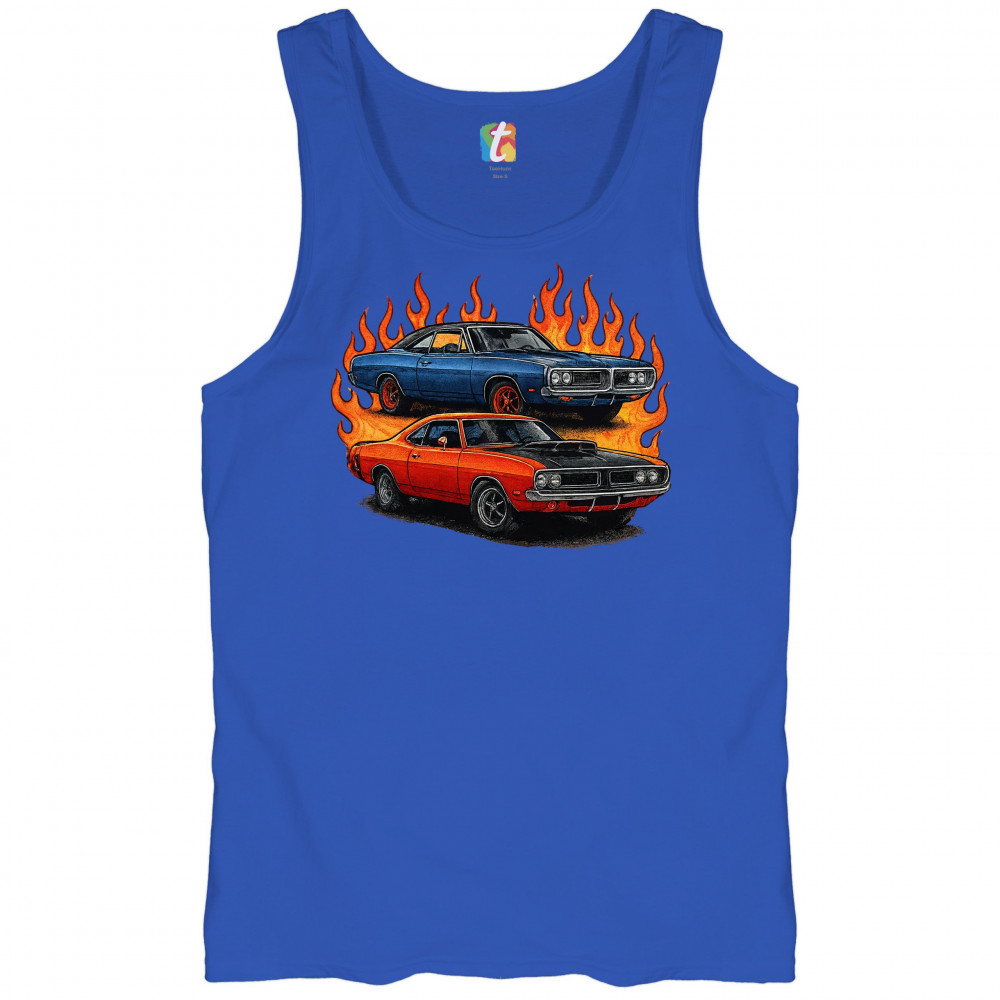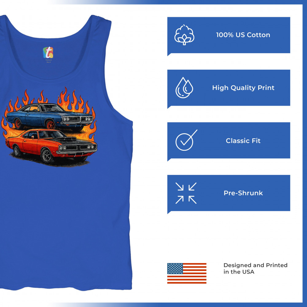 Bold flame design with classic muscle cars for gearheads and vintage horsepower lovers. Perfect for shows, cruise meets, and burnout nights.