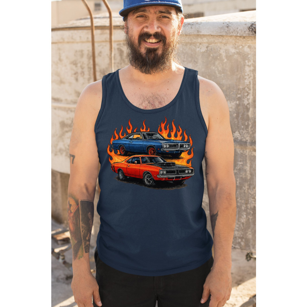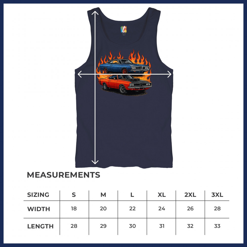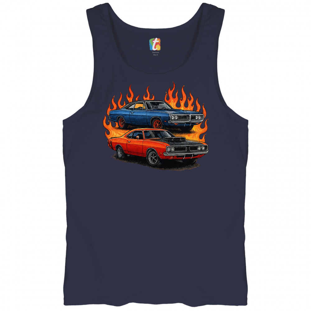 Bold flame design with classic muscle cars for gearheads and vintage horsepower lovers. Perfect for shows, cruise meets, and burnout nights.