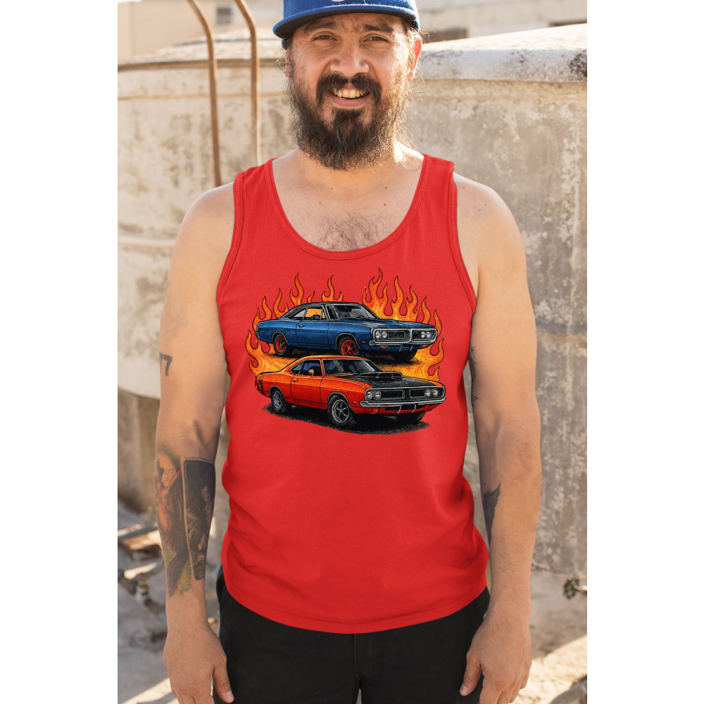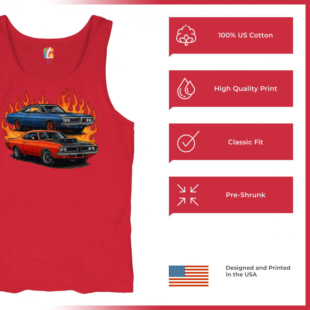 Bold flame design with classic muscle cars for gearheads and vintage horsepower lovers. Perfect for shows, cruise meets, and burnout nights.