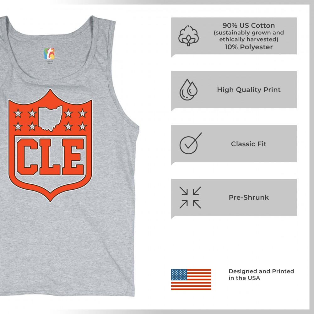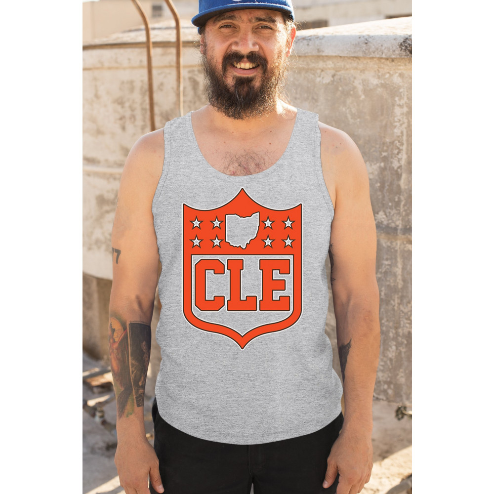 Bold CLE shield design honoring Cleveland football nation with Rust Belt pride, underdog grit, and blue collar sports heritage.