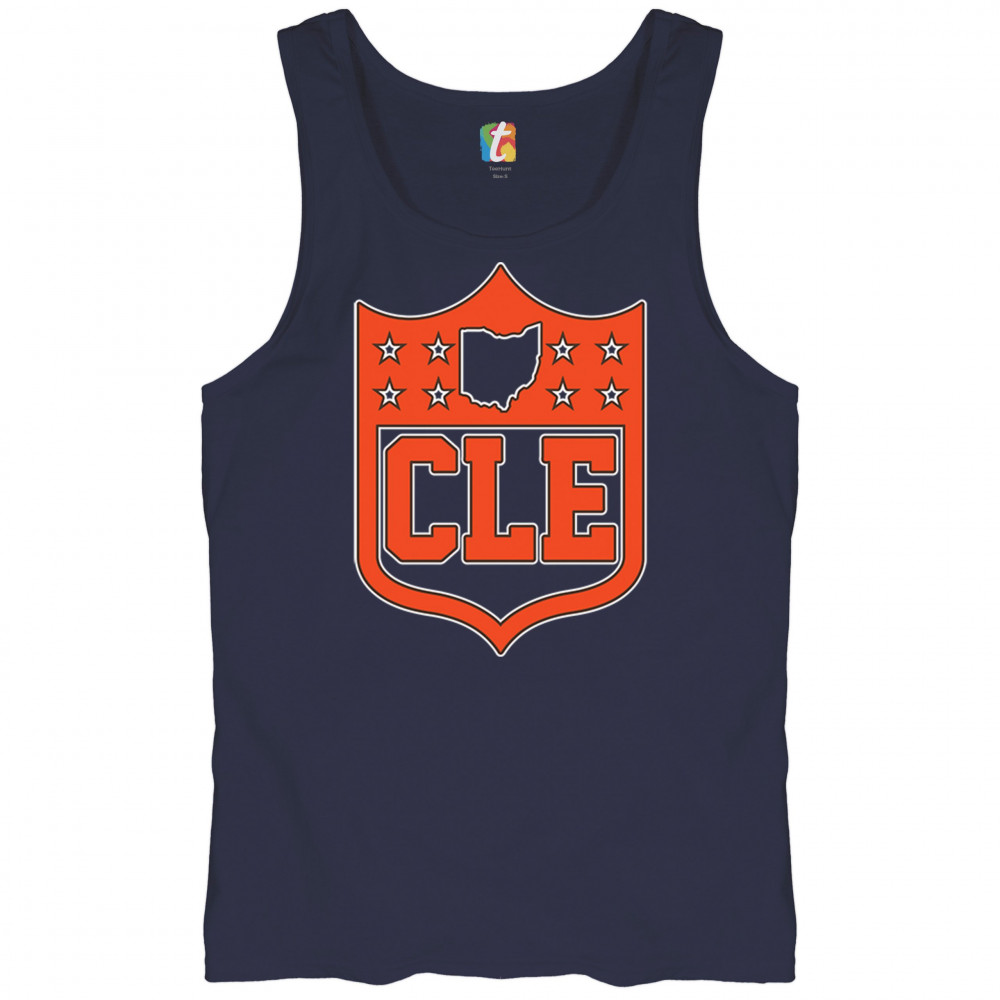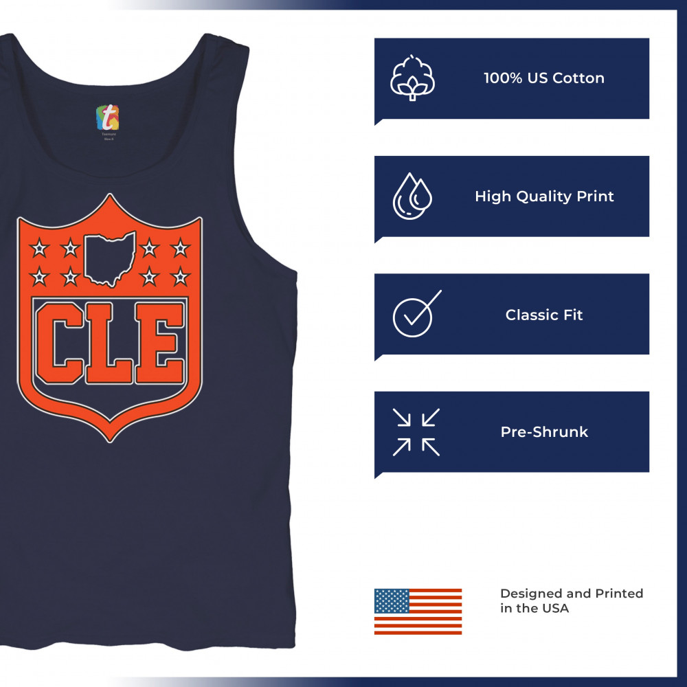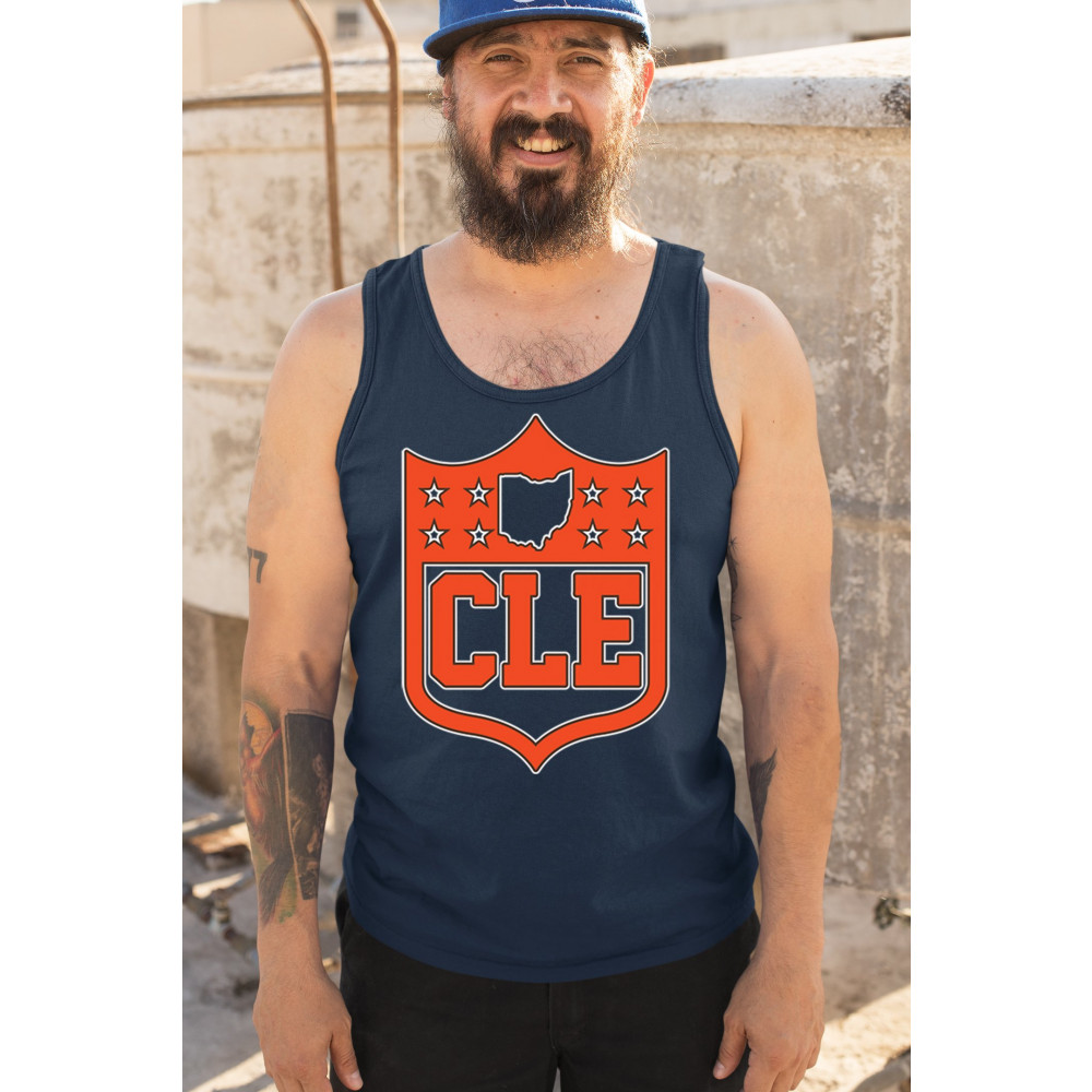 Bold CLE shield design honoring Cleveland football nation with Rust Belt pride, underdog grit, and blue collar sports heritage.