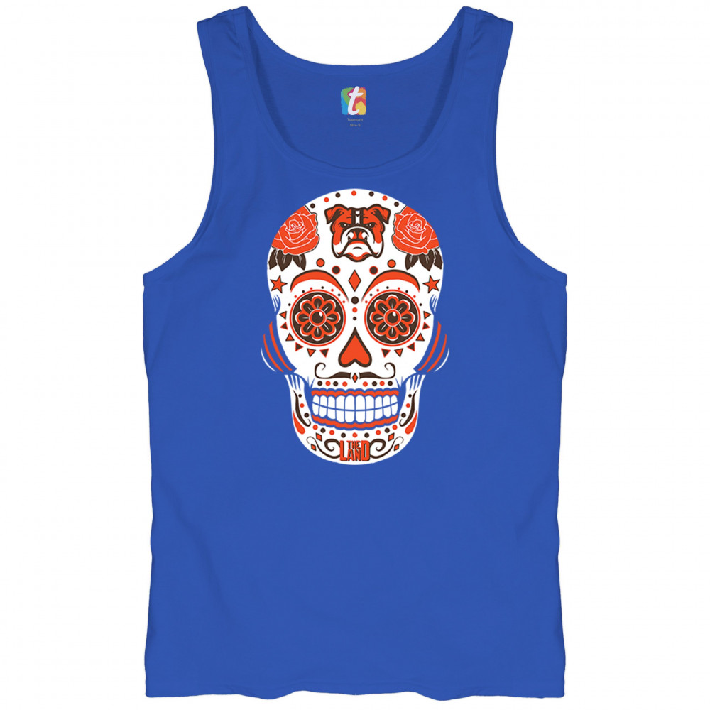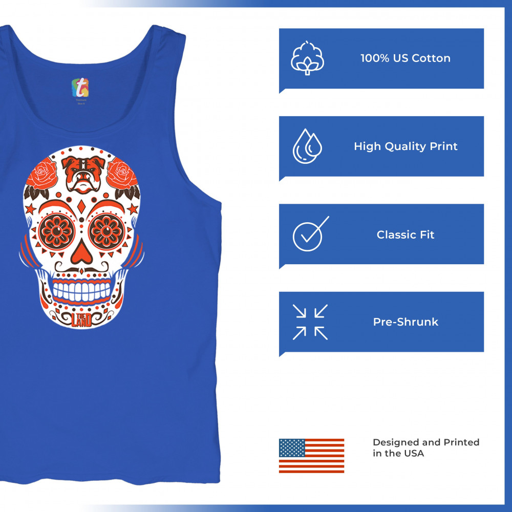 Cleveland Sugar Skull with Lake Erie pride, Rust Belt football grit, orange & brown tradition, playoff vibes, and Game Day passion.