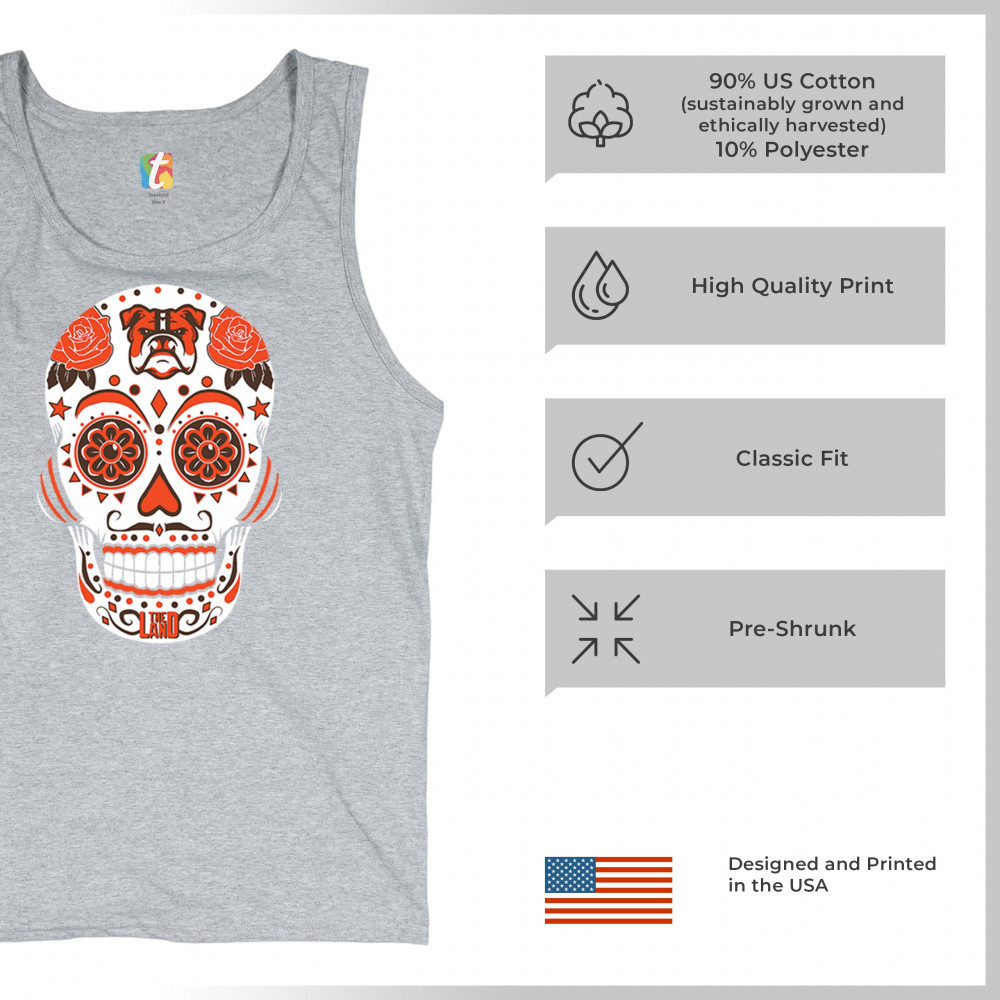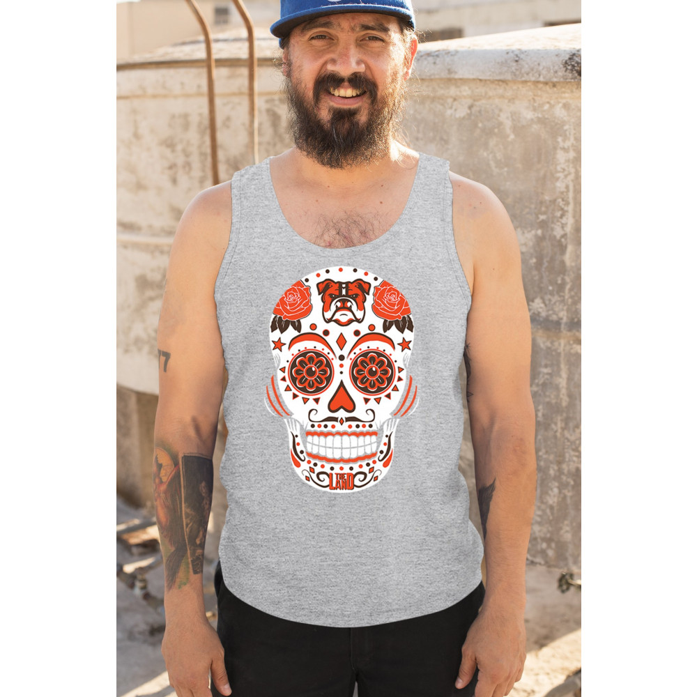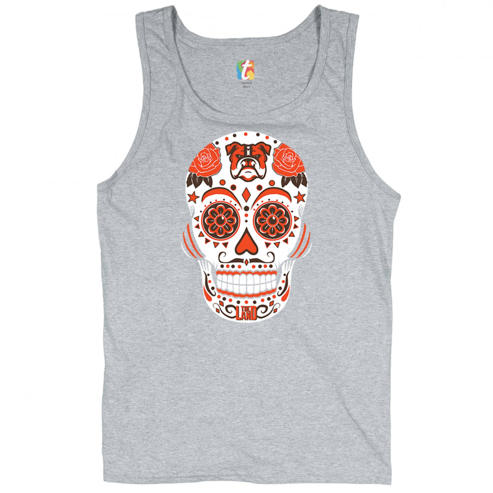 Cleveland Sugar Skull with Lake Erie pride, Rust Belt football grit, orange & brown tradition, playoff vibes, and Game Day passion.