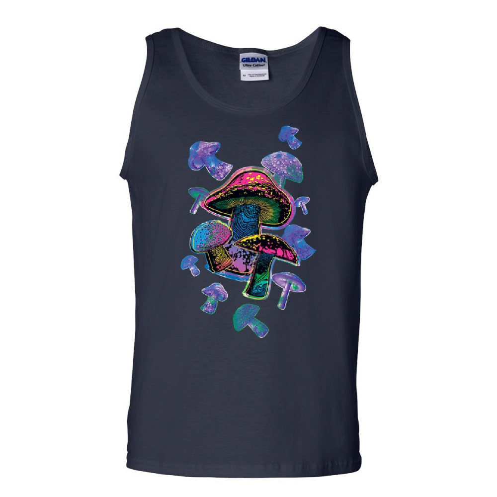 NEON MUSHROOMS colorful tank top shrooms psychedelic psilocybin sleeveless navy blue