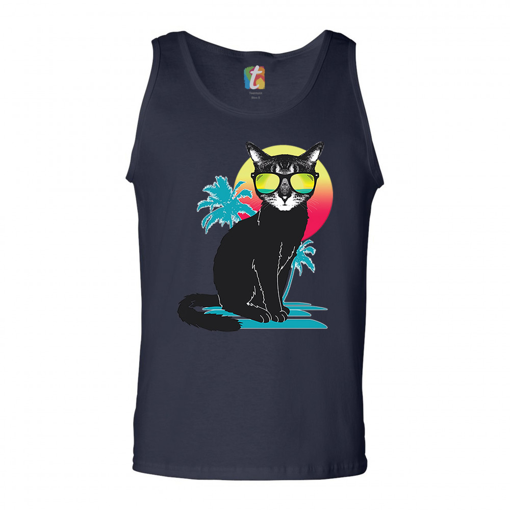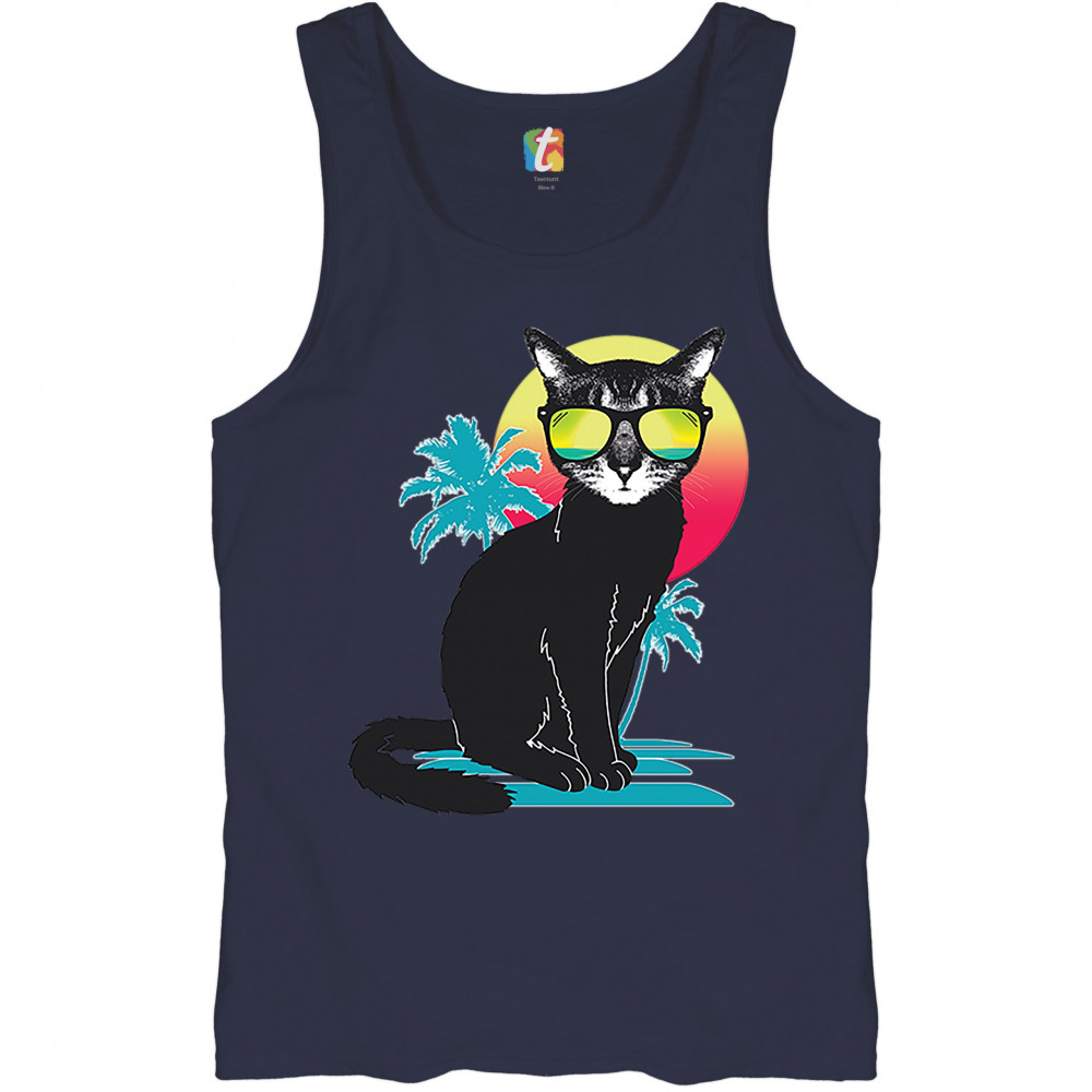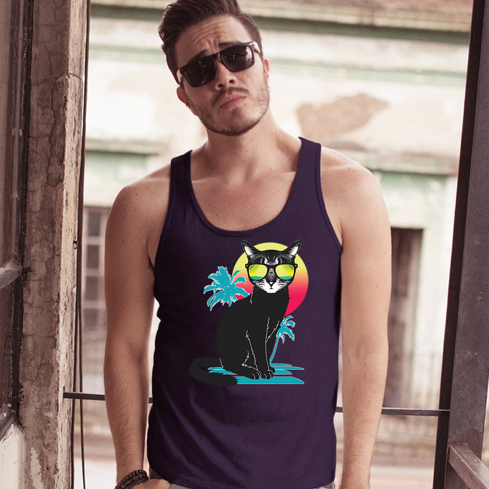 COOL SUMMER CAT tank top neon kitty on a beach animal lovers men's top navy blue