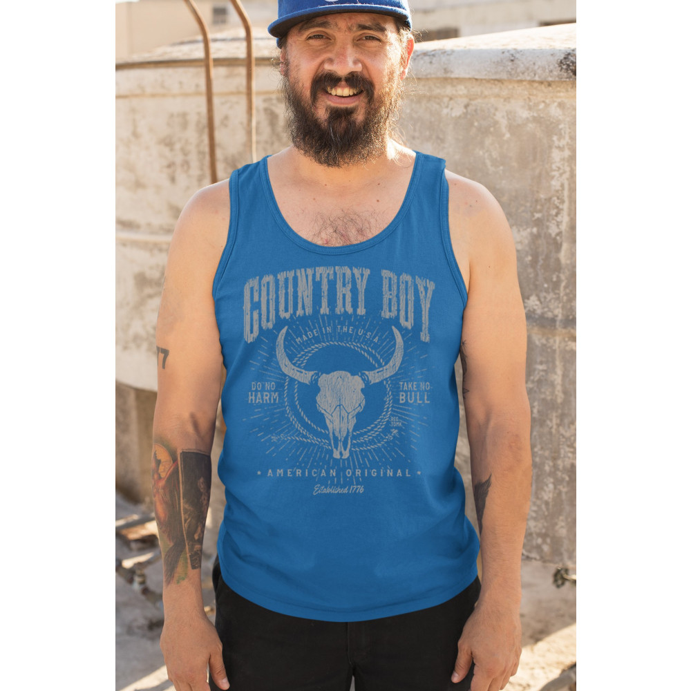 Bold country boy design with bull skull, distressed western style, patriotic grit, and the phrase “Do No Harm, Take No Bull.â€