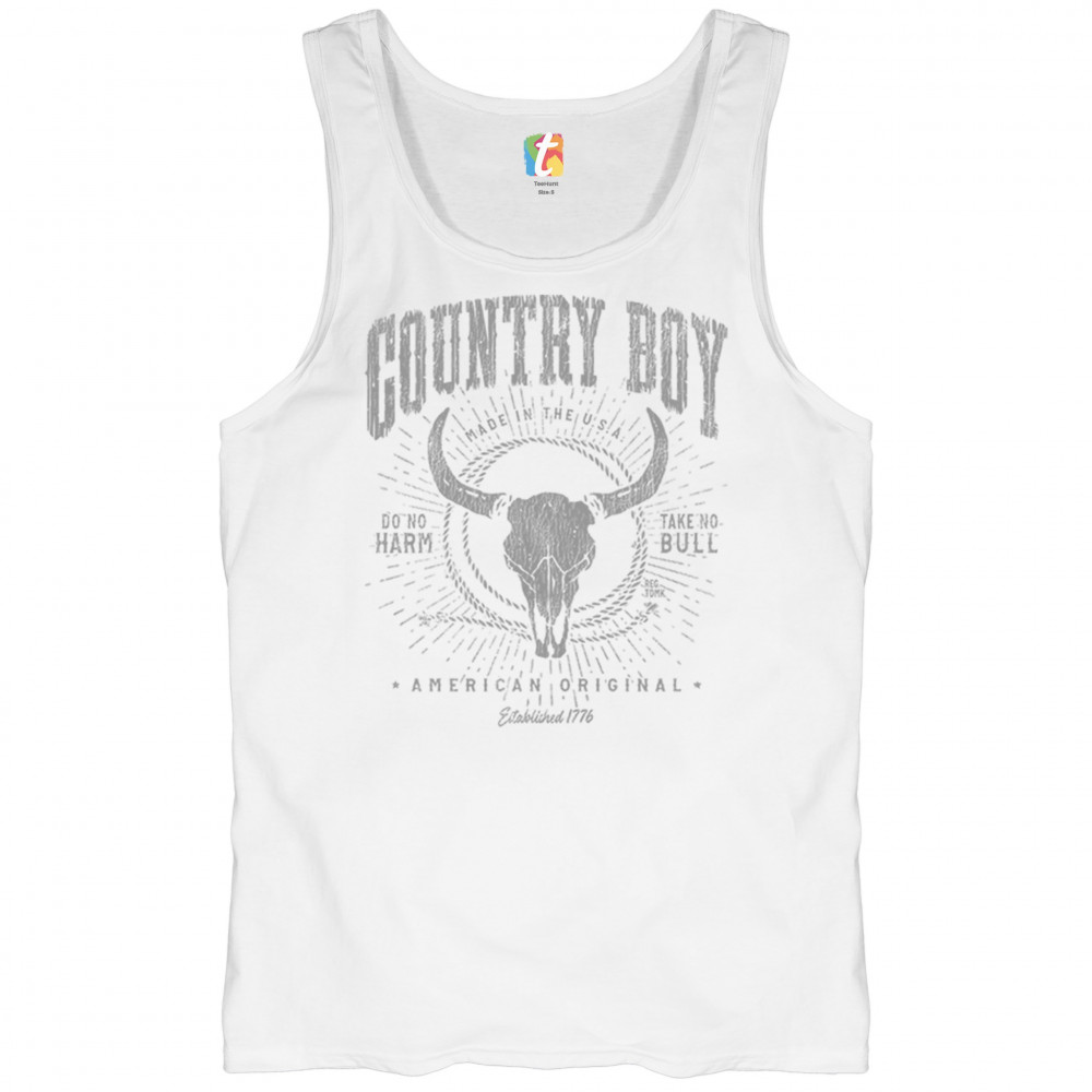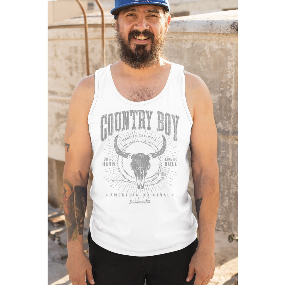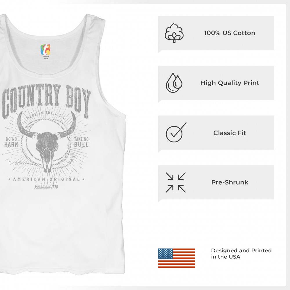 Bold country boy design with bull skull, distressed western style, patriotic grit, and the phrase “Do No Harm, Take No Bull.â€