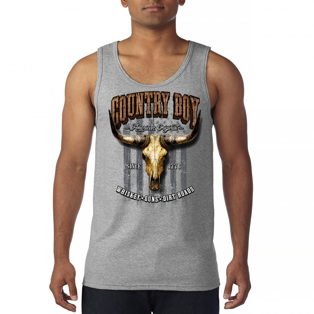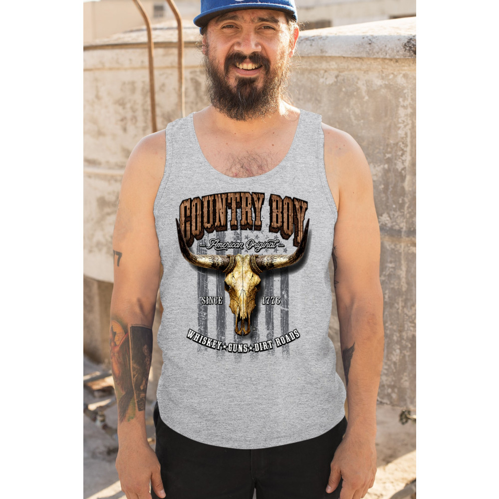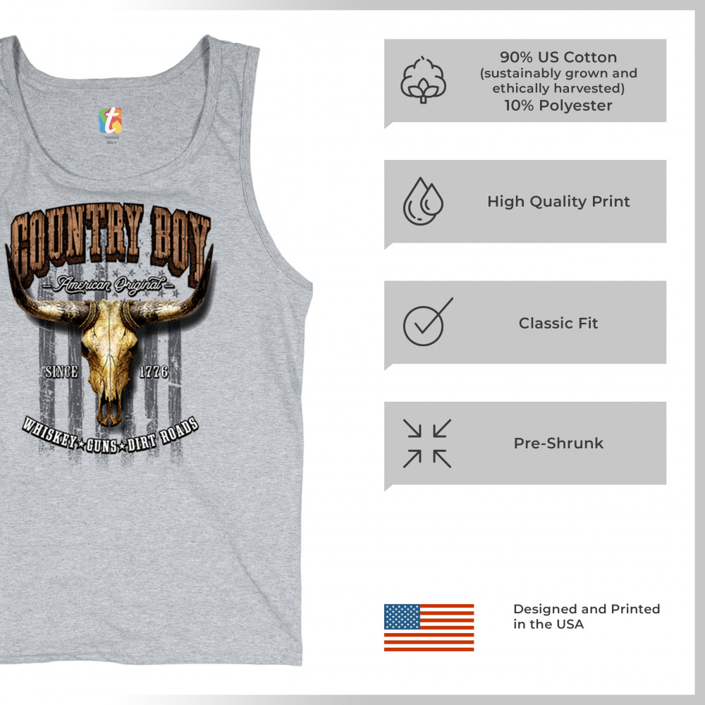 Country Boy – American Original. This bold western design captures the essence of southern living with a vintage bull skull, rustic lettering, and pride in whiskey, guns, and dirt roads. From 1776 to today, it honors the heritage of freedom-loving country men. Wear it to rodeos, bonfires, or muddy trails.