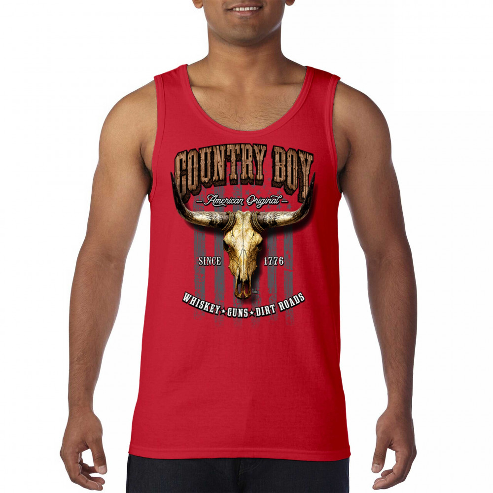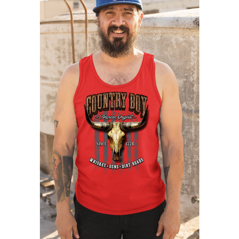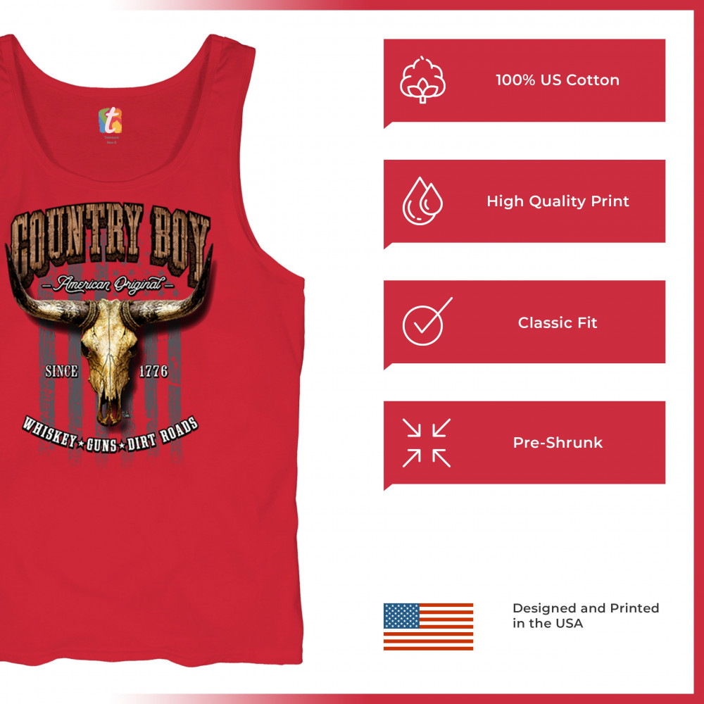 Country Boy – American Original. This bold western design captures the essence of southern living with a vintage bull skull, rustic lettering, and pride in whiskey, guns, and dirt roads. From 1776 to today, it honors the heritage of freedom-loving country men. Wear it to rodeos, bonfires, or muddy trails.