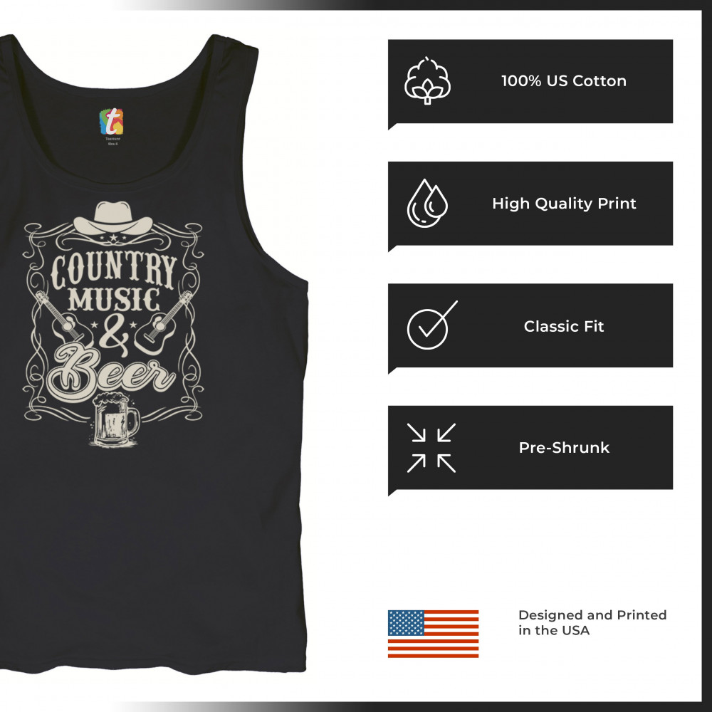 Country music and beer unite in this rustic design with cowboy hat, guitars, and scrollwork. Great for rodeos, festivals, and southern pride.