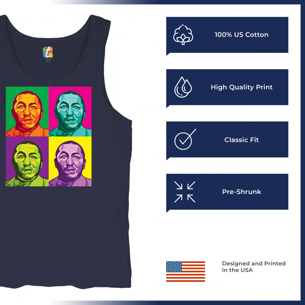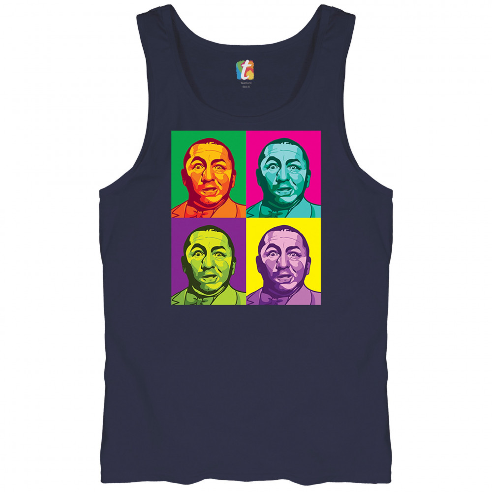 Introducing our dazzling pop art collection, headlined by the inimitable Curly of the Three Stooges! With a quartet of vivid hues, this T-shirt is a contemporary twist on classic humor. It's a standout piece for any fan's collection, capturing the timeless expression of Curly in a modern art style that's sure to turn heads and spark smiles.