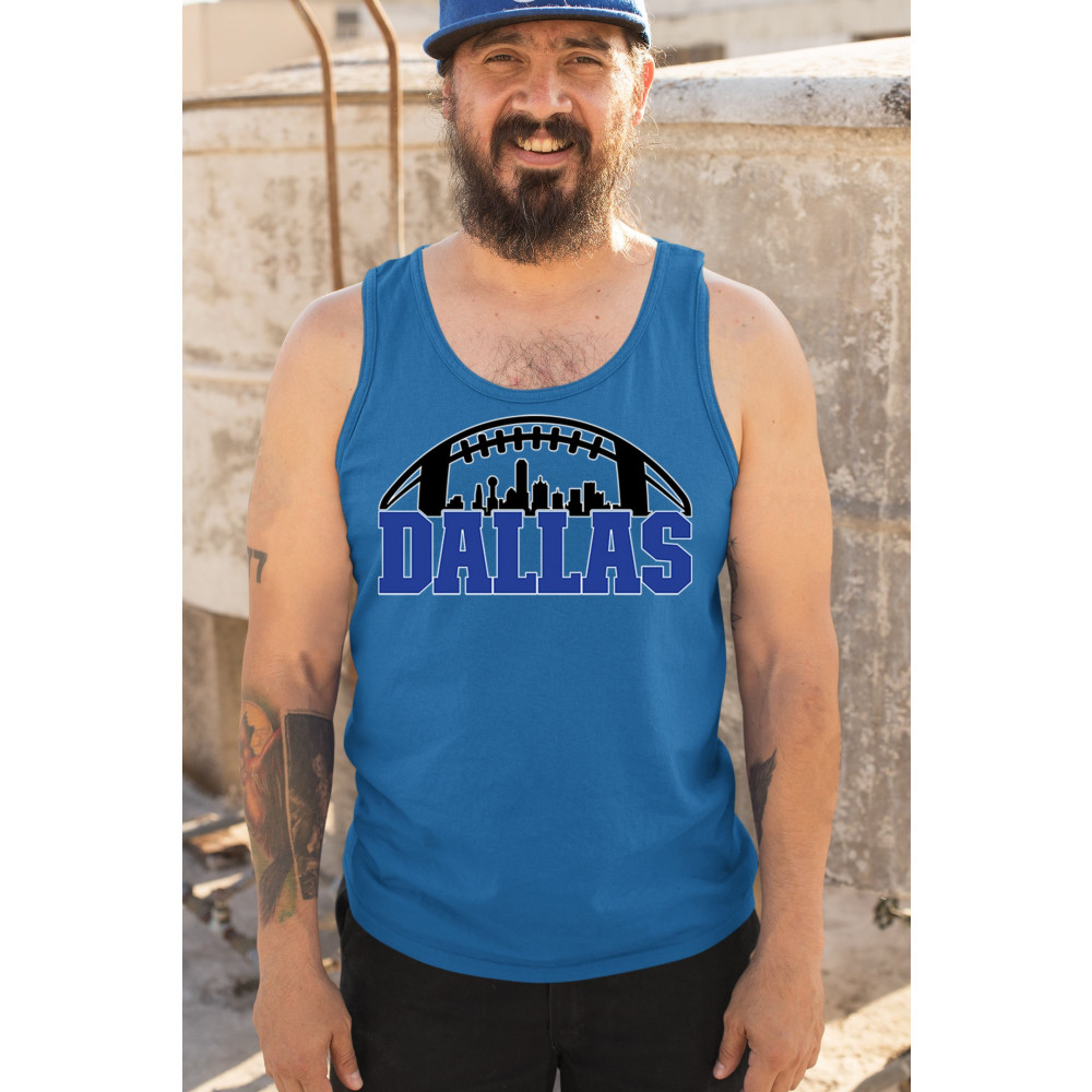 Show off your Dallas pride with a bold football-themed design featuring the city's skyline. Perfect for game days, tailgates, and passionate fans.