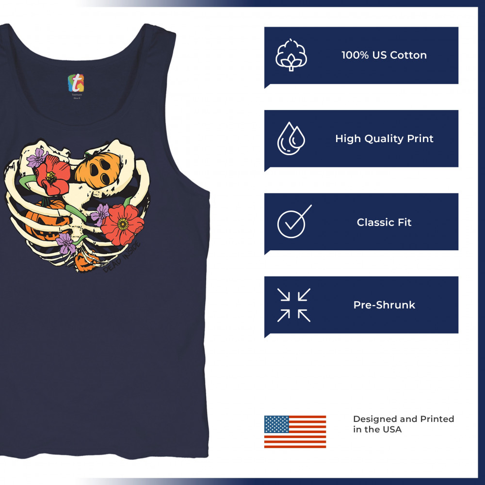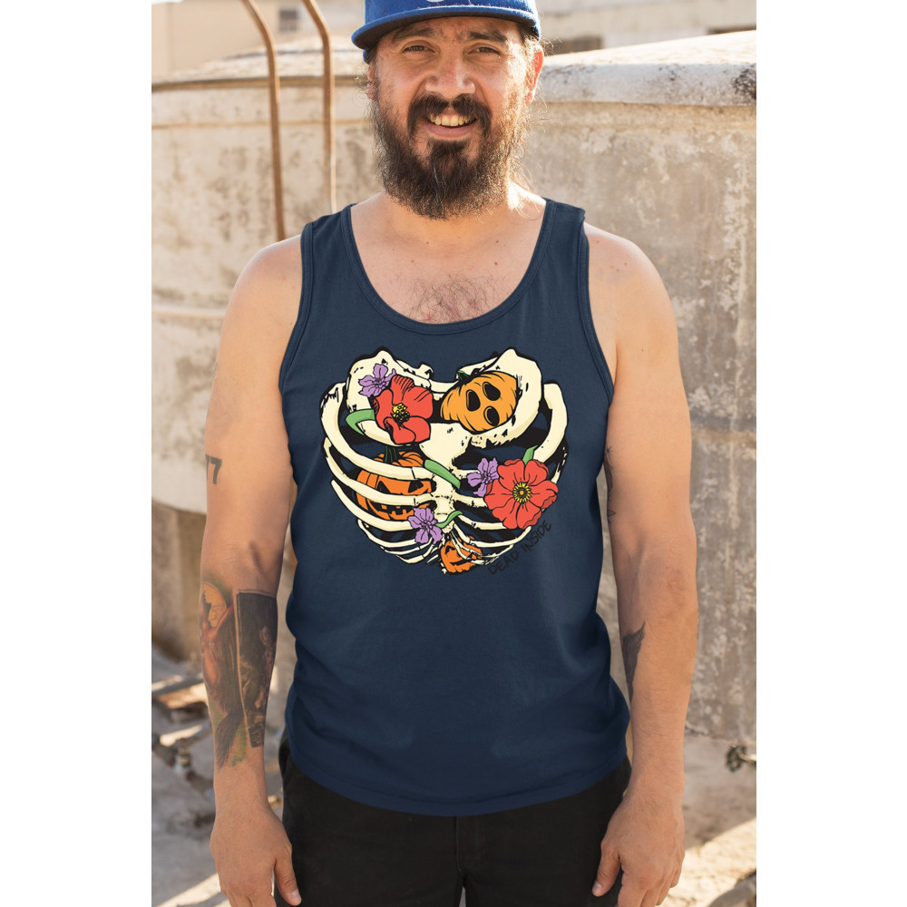 Celebrate Halloween with a quirky and cute design featuring a skeleton ribcage filled with pumpkins and flowers. Perfect for spooky season lovers!