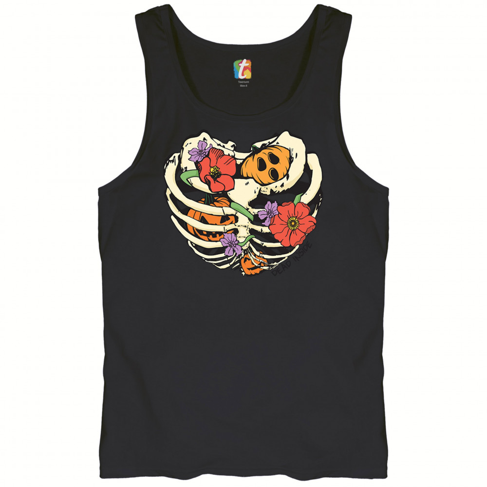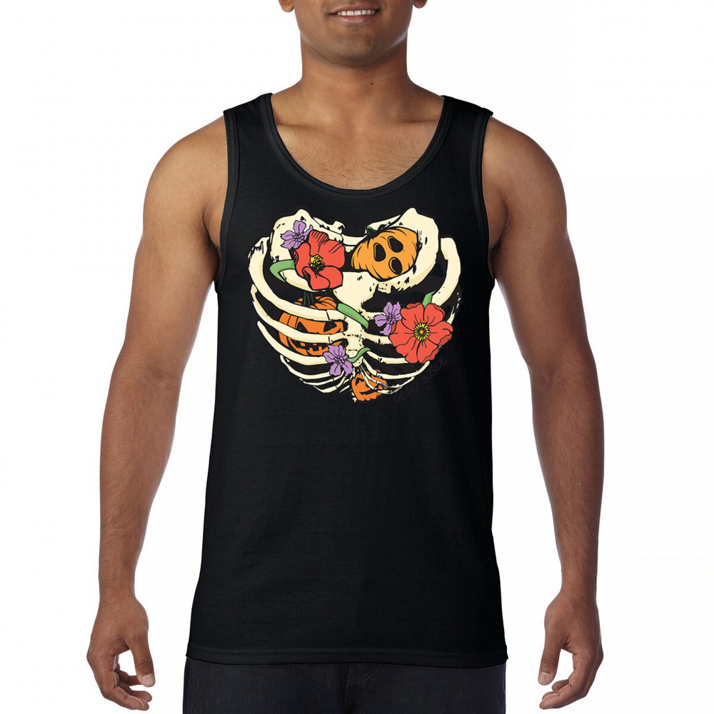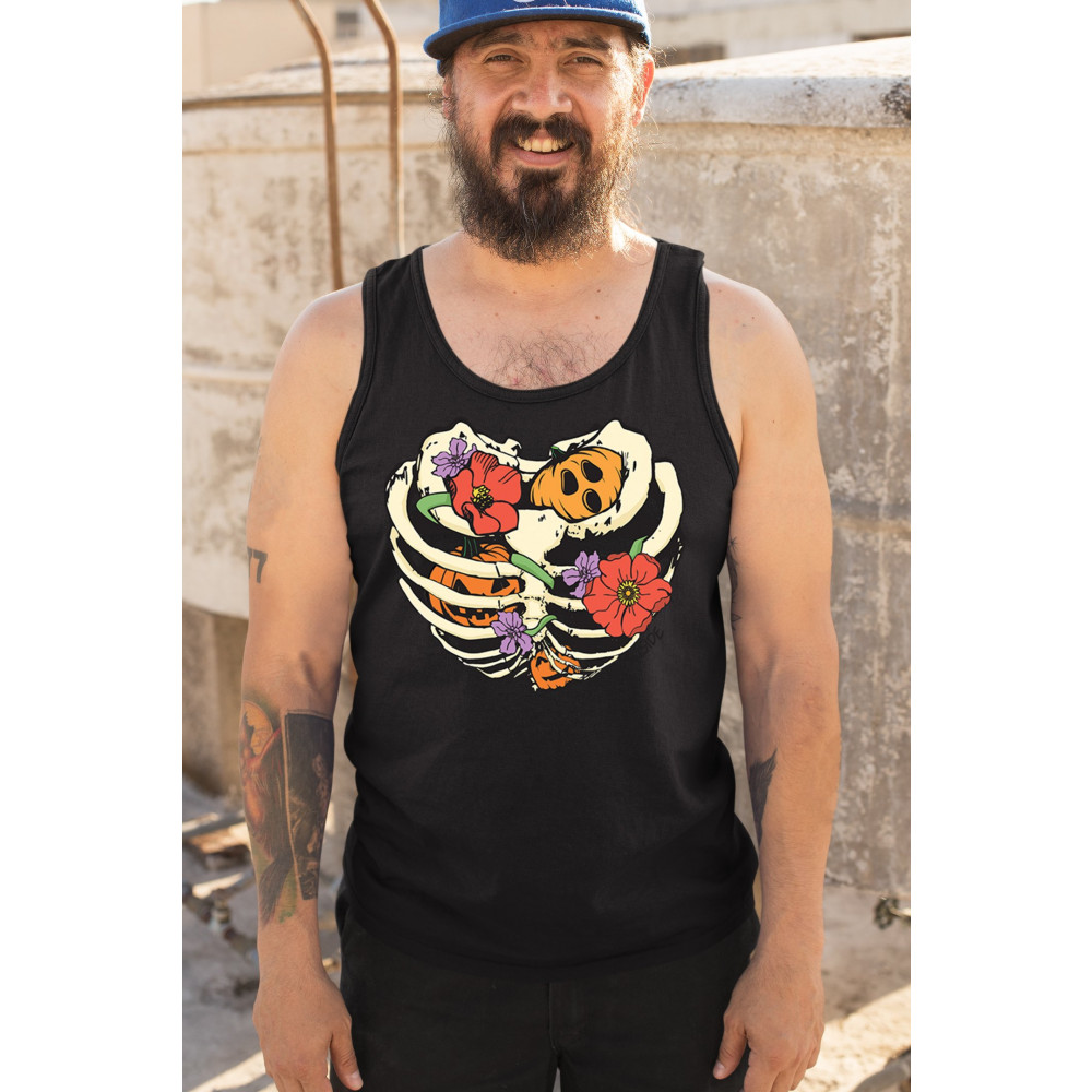 Celebrate Halloween with a quirky and cute design featuring a skeleton ribcage filled with pumpkins and flowers. Perfect for spooky season lovers!