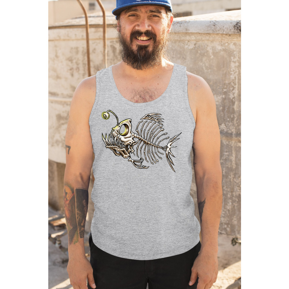 Creepy angler fish skeleton with glowing eye and horror bones. Perfect for sea lovers, divers, Halloween, and marine biology fans.