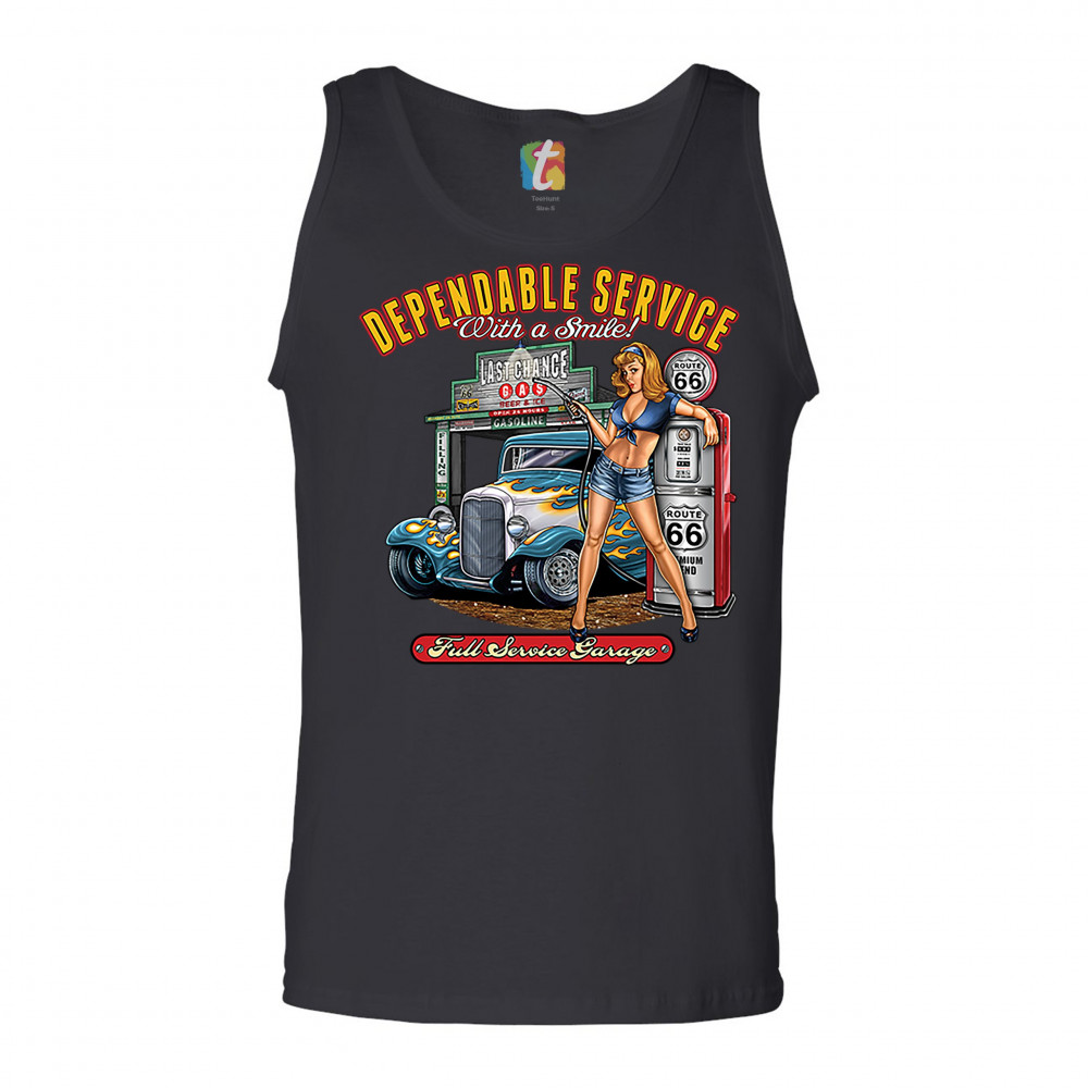 A print featuring a sexy pin-up girl standing by a gas pump with Route 66 signs on it. Behind her there is a garage with a hot rod parked at it. The print says: "Dependable Service With a Smile!" at the top and "Full Service Garage" at the bottom. A great