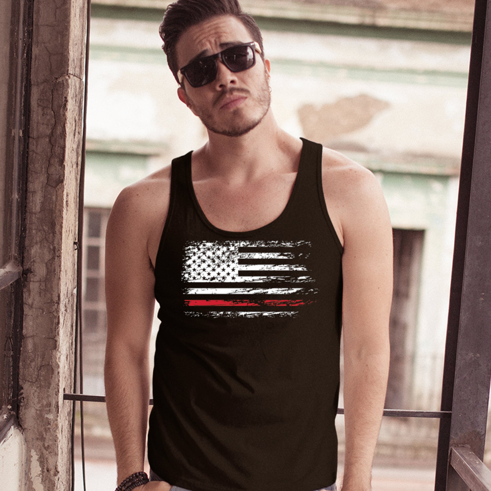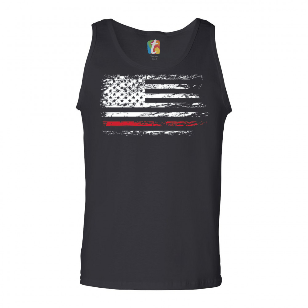 DISTRESSED AMERICAN FLAG tank top thind red line firefighter men's top black