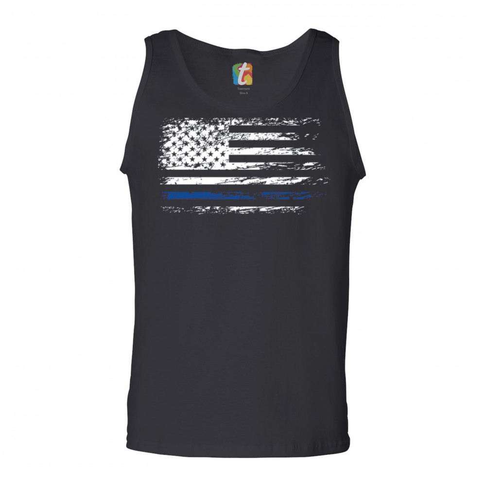 DISTRESSED THIN BLUE LINE AMERICAN FLAG tank top patriotic police men's top black