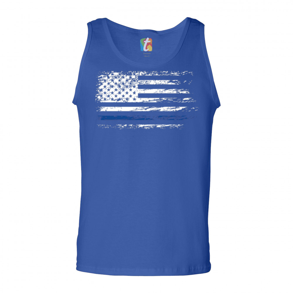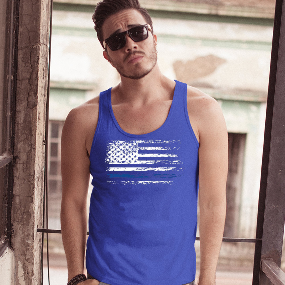 DISTRESSED THIN BLUE LINE AMERICAN FLAG tank top patriotic police men's top royal blue