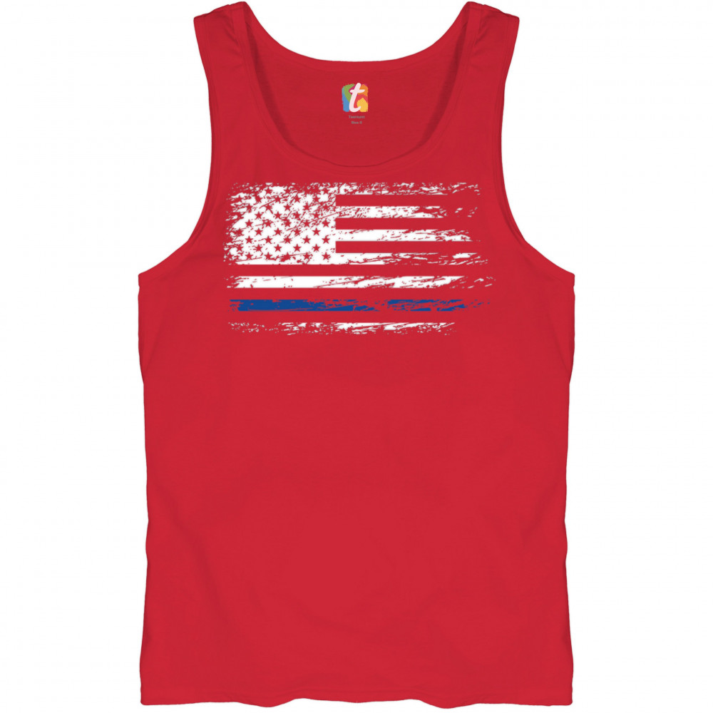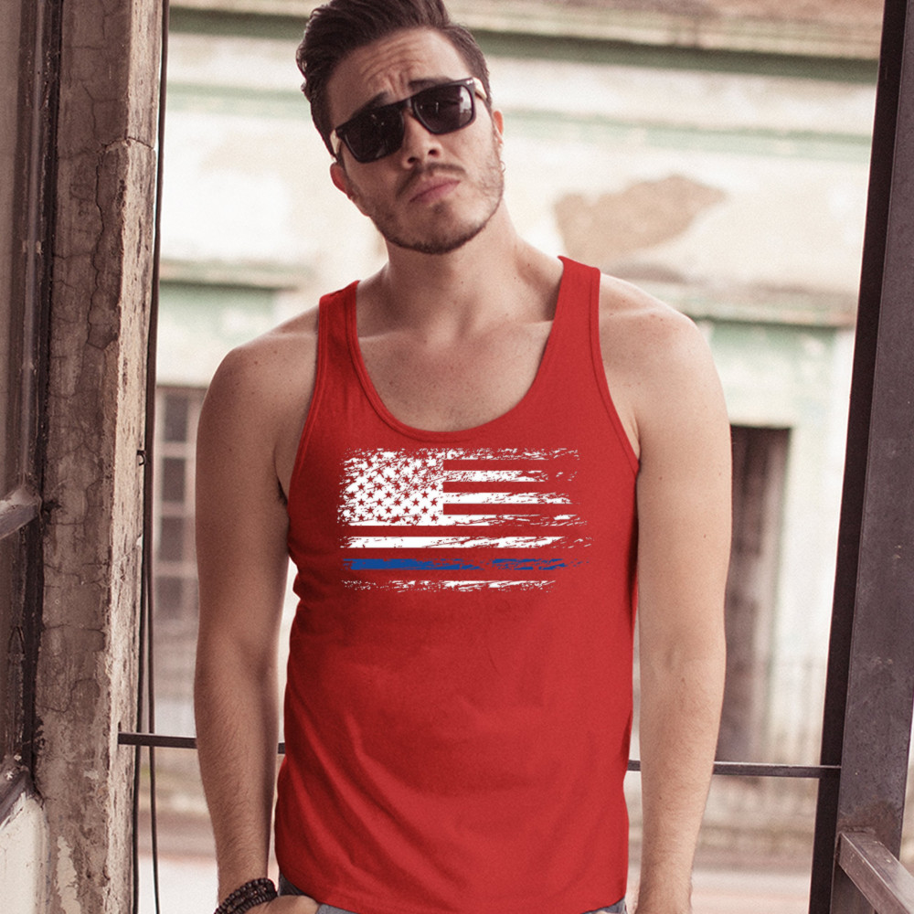 DISTRESSED THIN BLUE LINE AMERICAN FLAG tank top patriotic police men's top red