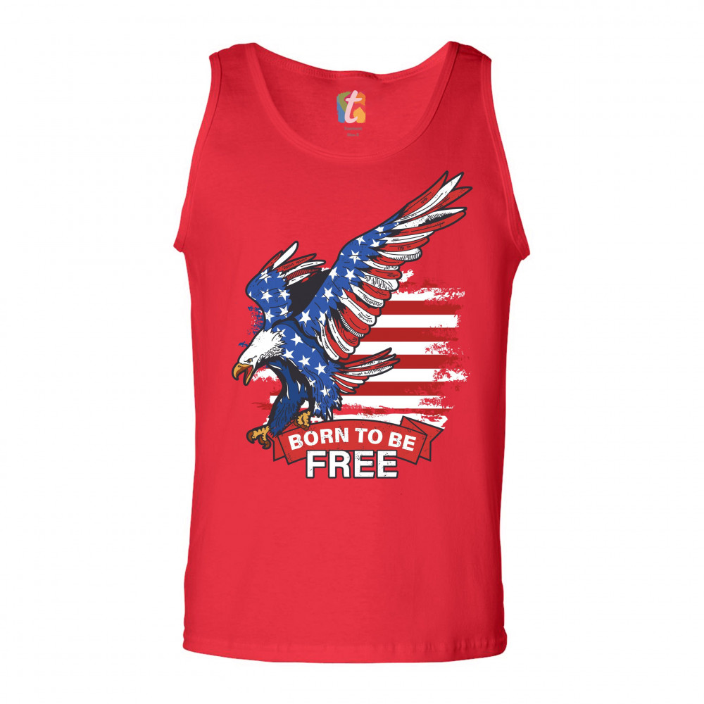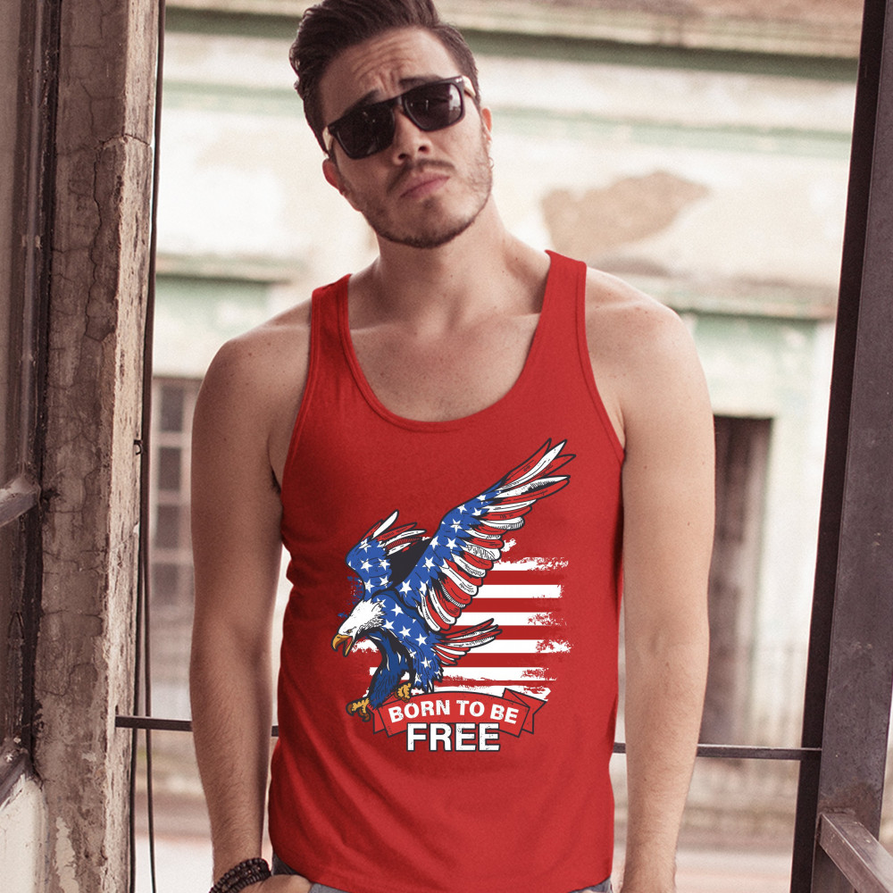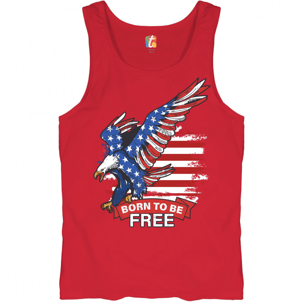 A patriotic print saying "Born to Be Free" and featuring a diving American Bald Eagle. In the background there is a distressed American Flag and the eagle is covered with Stars and Stripes. Great choice to wear on Independence Day or any other patriotic h
