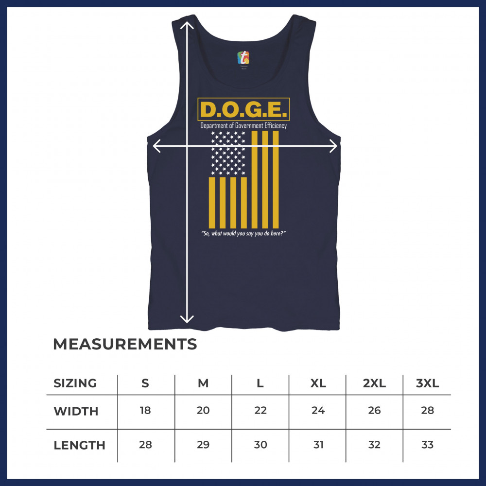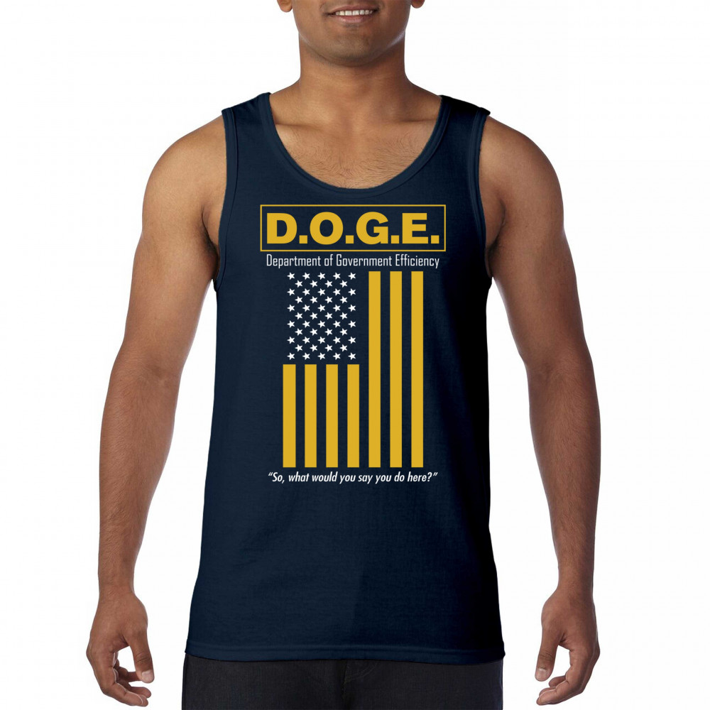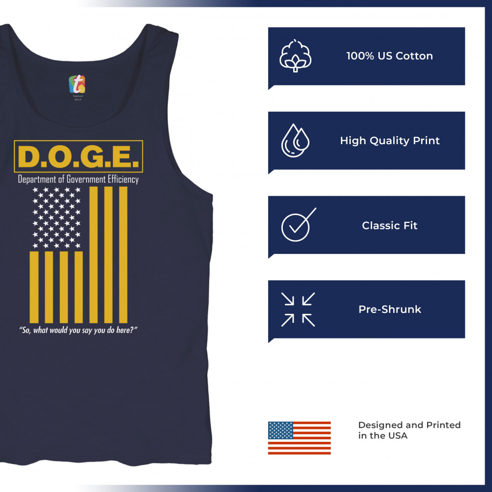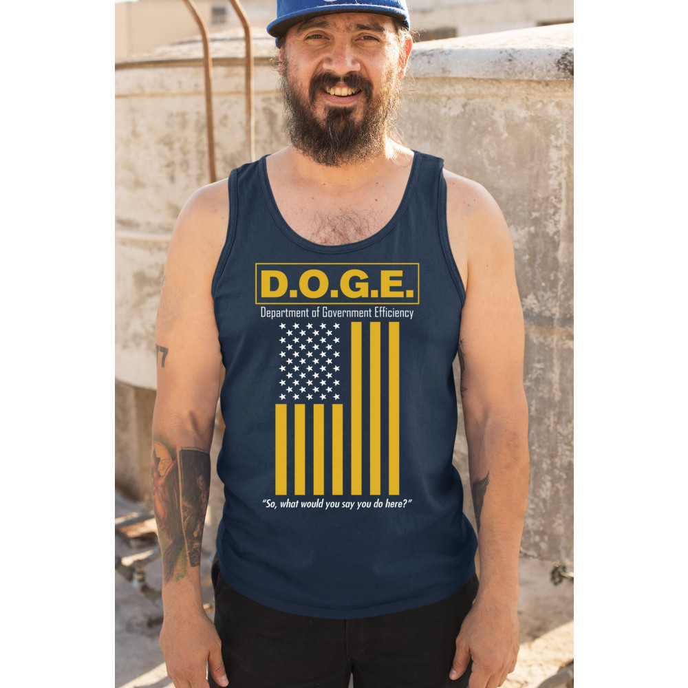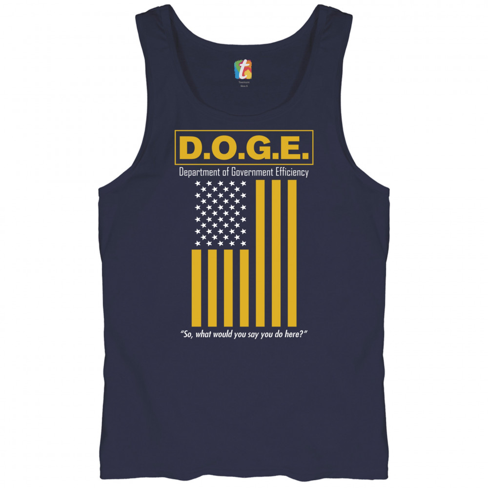 The D.O.G.E. Department of Government Efficiency design features bold yellow lettering and a sarcastic punchline aimed at bloated systems. Clean typography paired with a reimagined American flag gives this political parody retro appeal. Ideal for libertarians, patriots, or anyone fed up with inefficiency and red tape.
