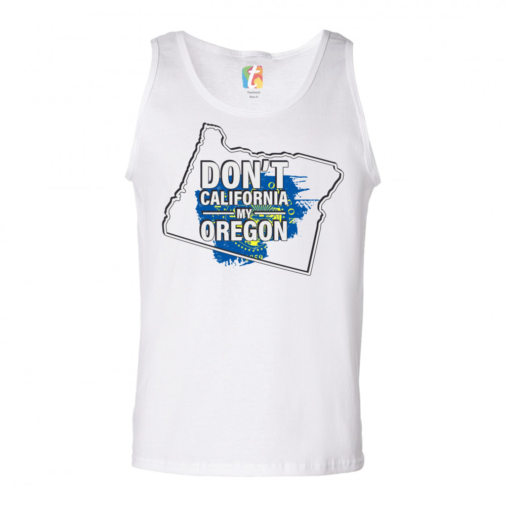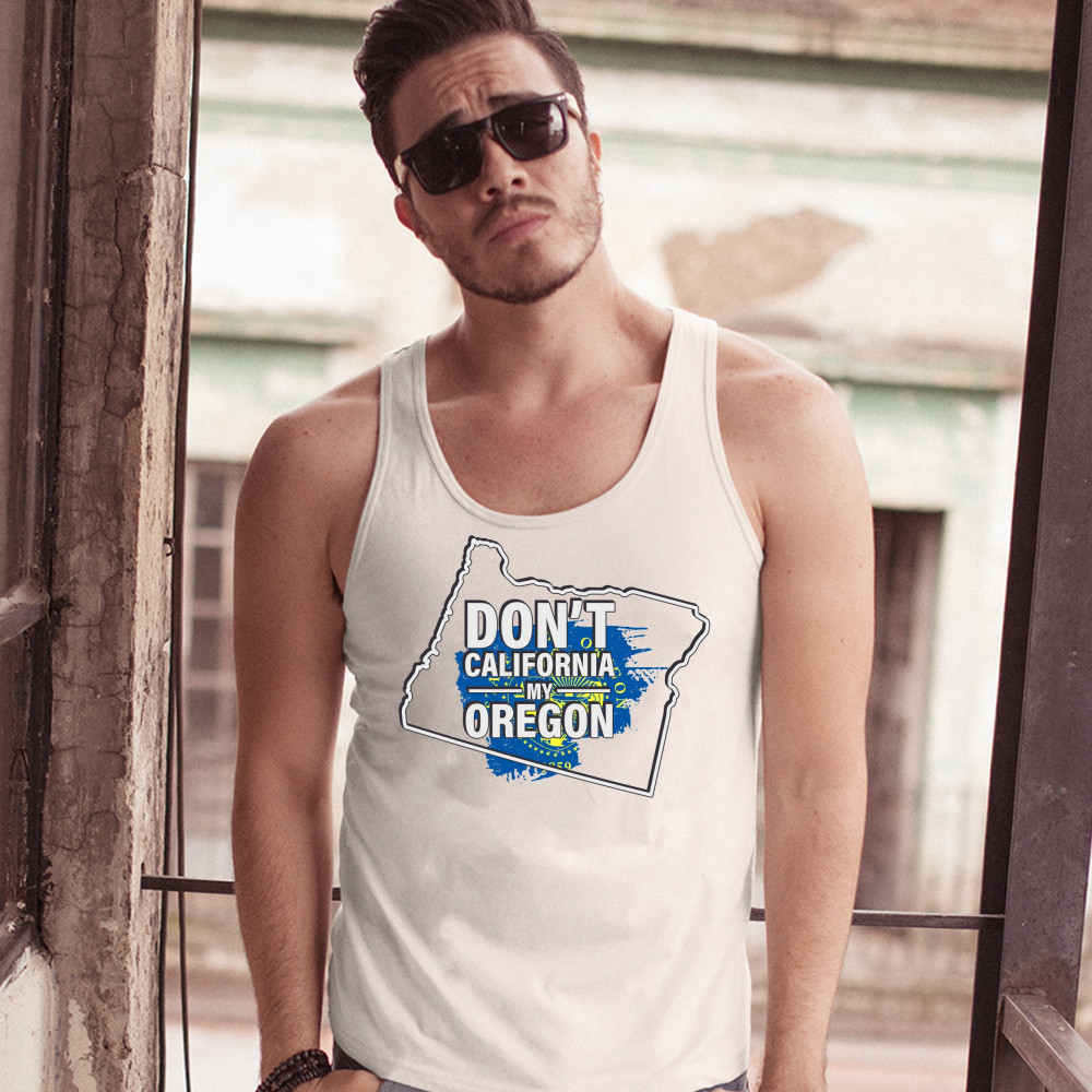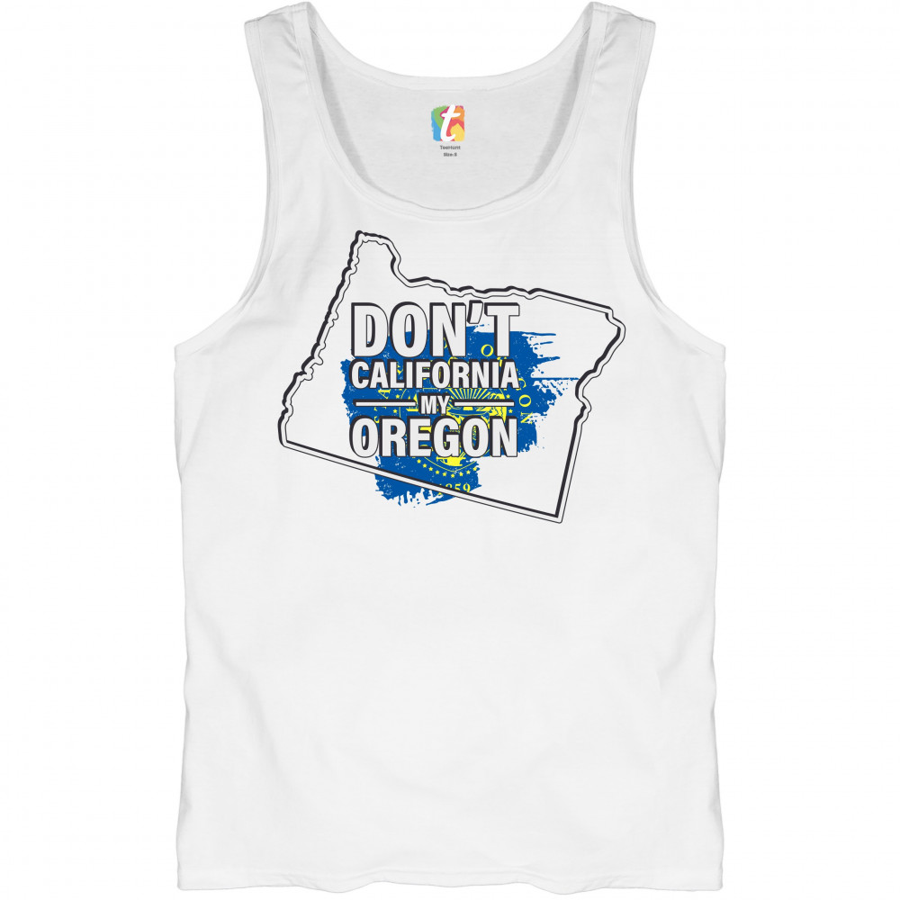 A political print featuring a silhouette of the state of Oregon and the Seal of the State of Oregon inside of it. The print says: "Don't California my Oregon". A great choice for anyone who is concerned for a huge number of Californians moving to their be