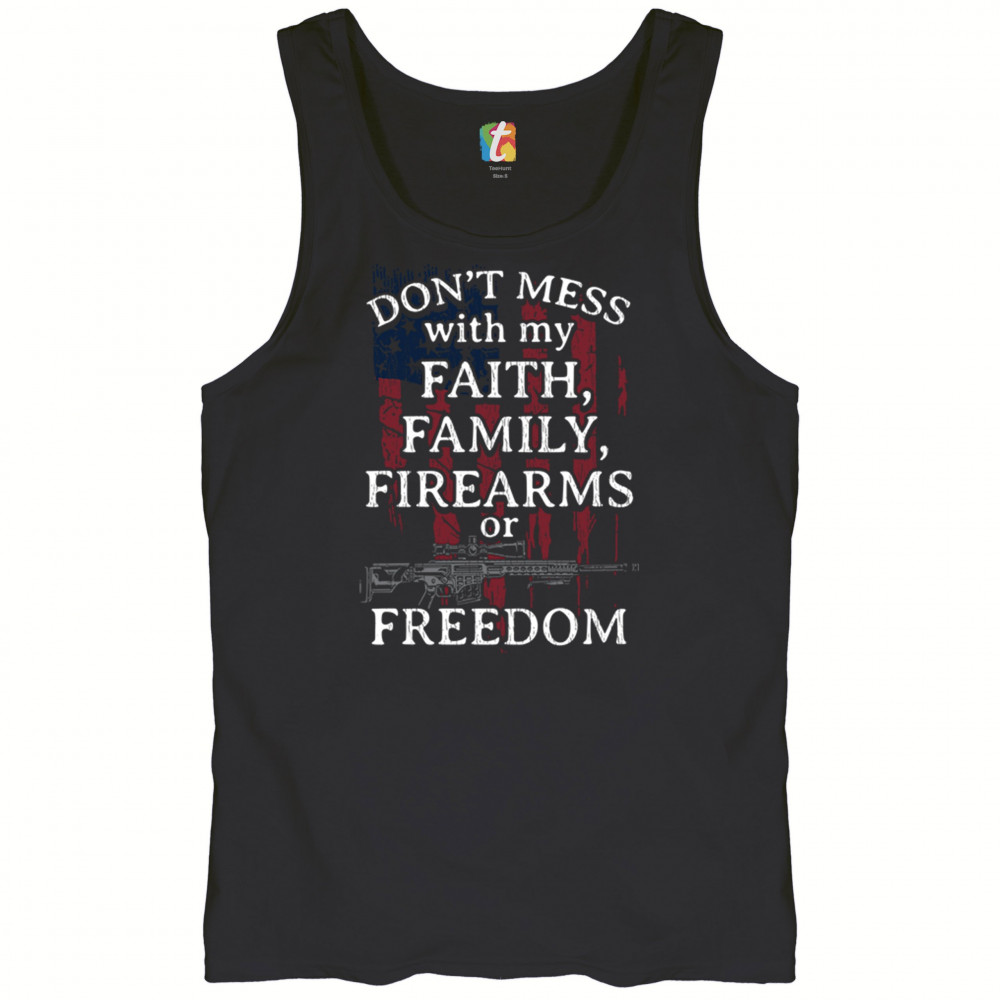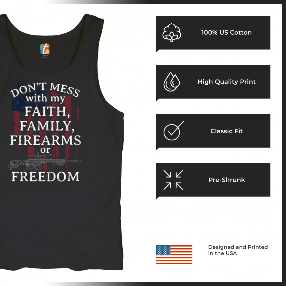 Patriotic shirt with "Don't Mess with My Faith, Family, Firearms, or Freedom" over distressed American flag. Perfect for patriots and veterans.