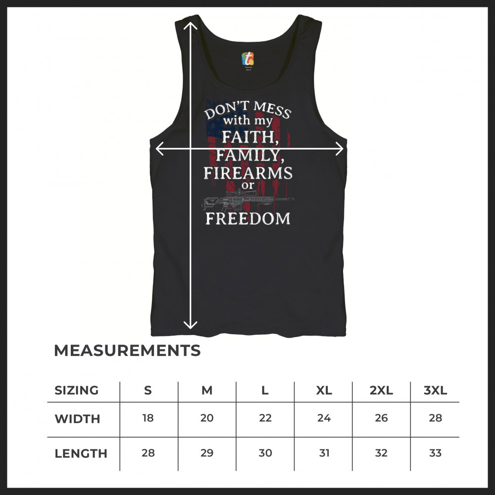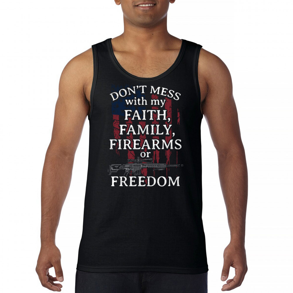 Celebrate your patriotism and core values with this powerful shirt featuring "Don't Mess with My Faith, Family, Firearms, or Freedom" set against a distressed American flag. This shirt is perfect for patriots, veterans, and those who hold their religious beliefs and the right to bear arms in high regard. Made from high-quality fabric, it ensures comfort and durability for everyday wear. Wear it proudly at patriotic events, on the 4th of July, or anytime you want to make a strong statement about your beliefs. It’s an excellent gift for anyone who shares these values and supports the American flag and the stars and stripes.
