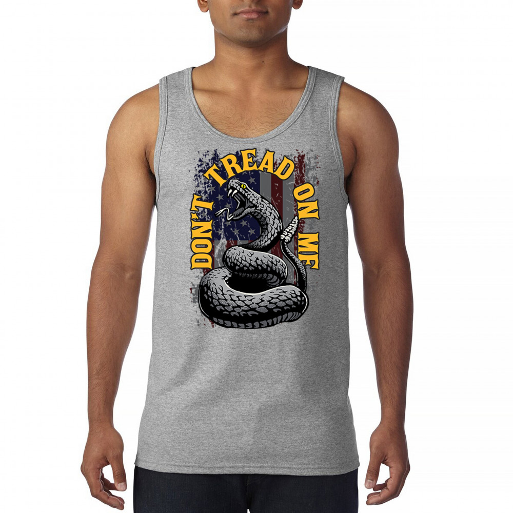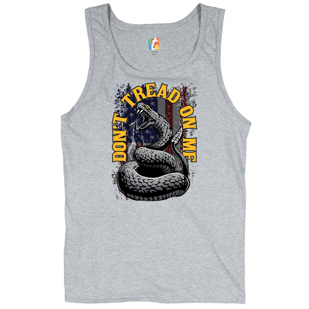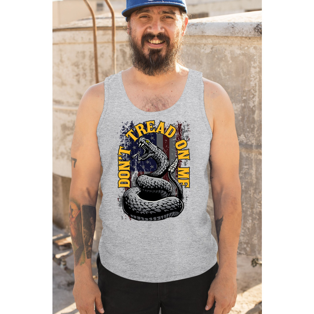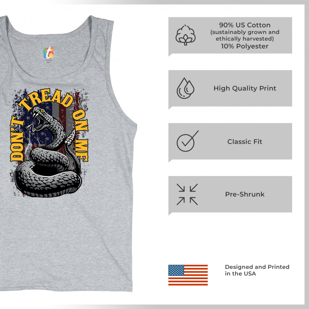Bold "Don't Tread on Me" design with snake and American flag. Ideal for patriots. Show your love for freedom and independence.