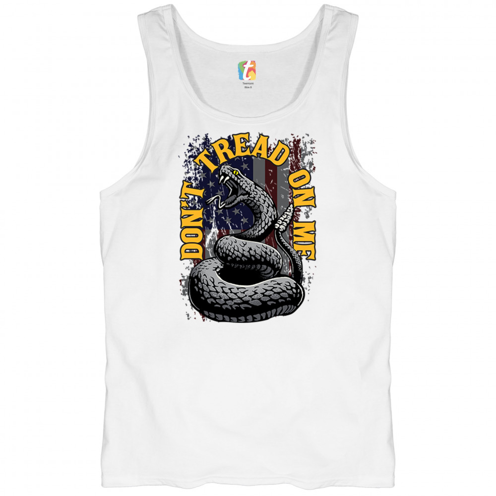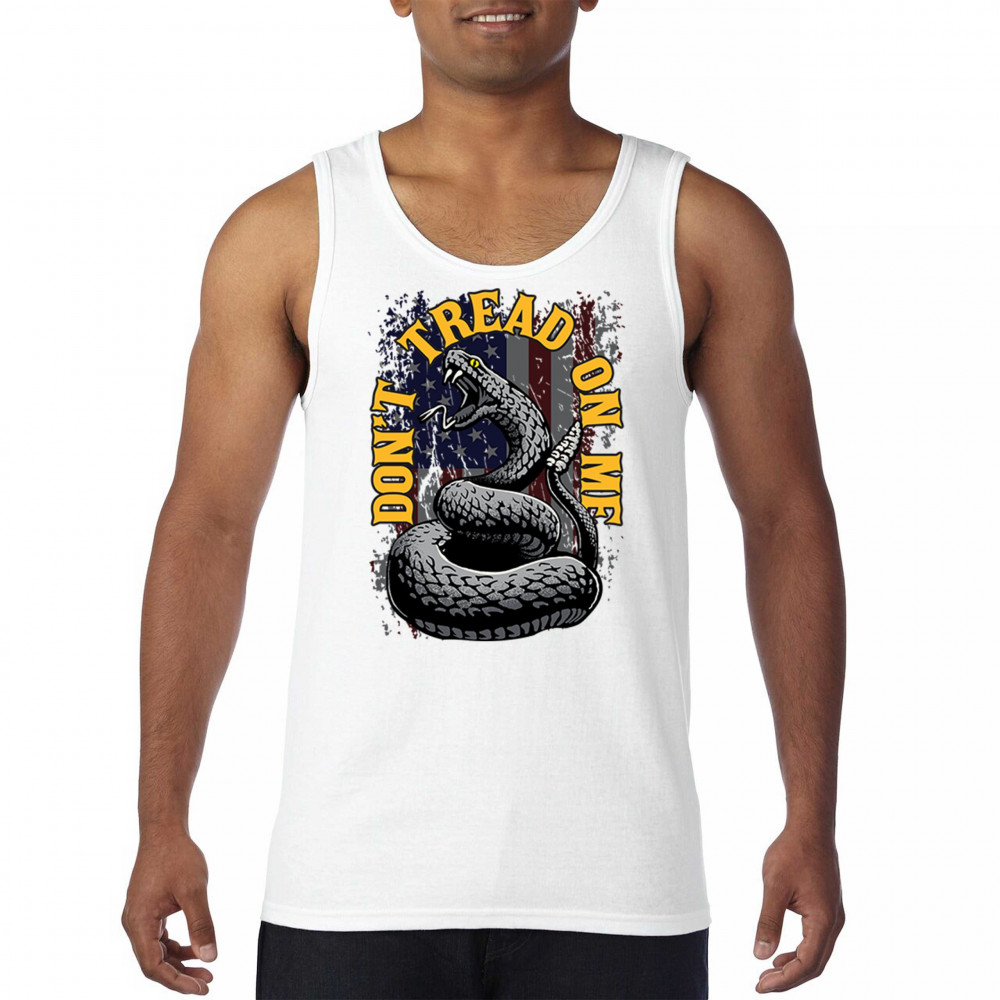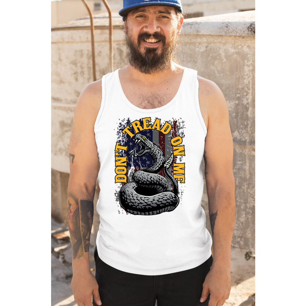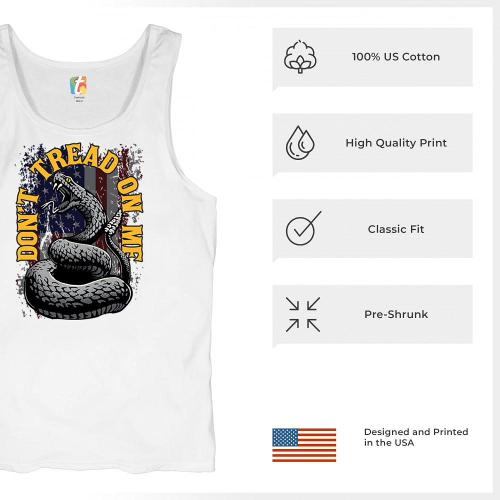 Bold "Don't Tread on Me" design with snake and American flag. Ideal for patriots. Show your love for freedom and independence.