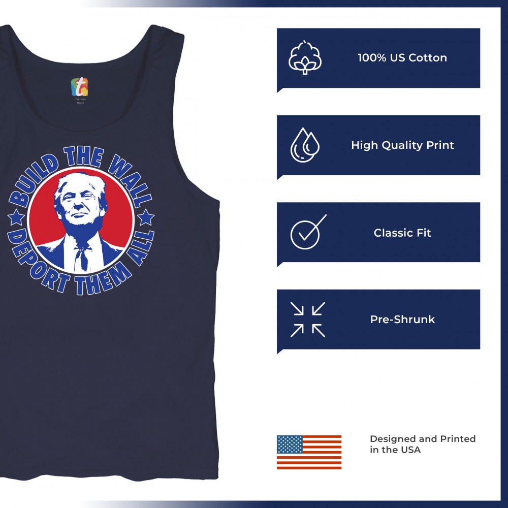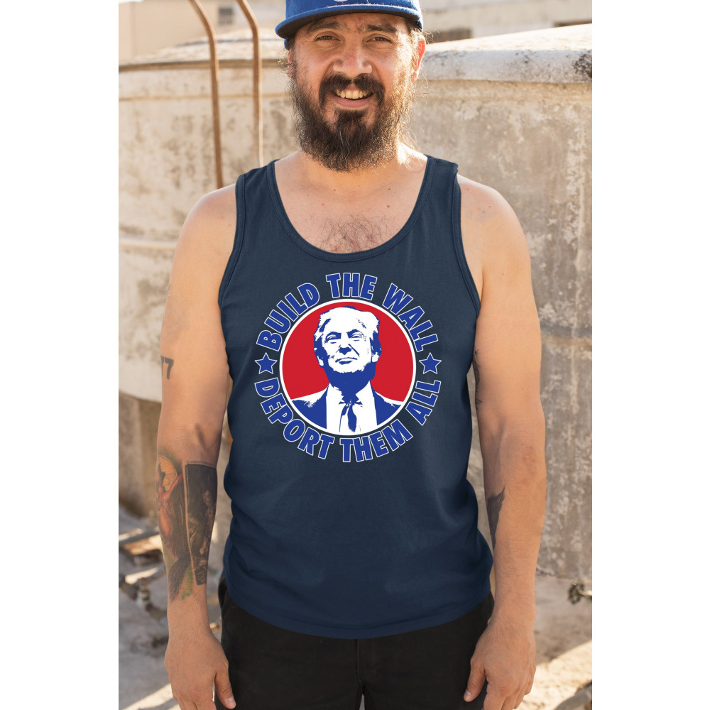 Showcase your unwavering support with a bold design that champions America first. Featuring the "Build the Wall Deport Them All Trump 2024" message, this piece is a must-have for conservatives, symbolizing trust in God over government, and a commitment to never surrender. Adorned with the American flag and a call to rebelution, it's perfect for any Trump supporter ready to stand against the tide.