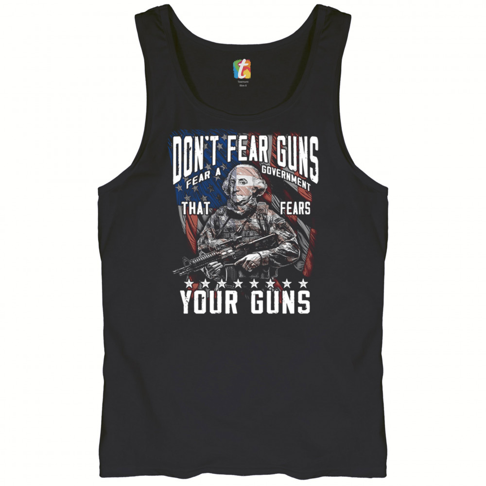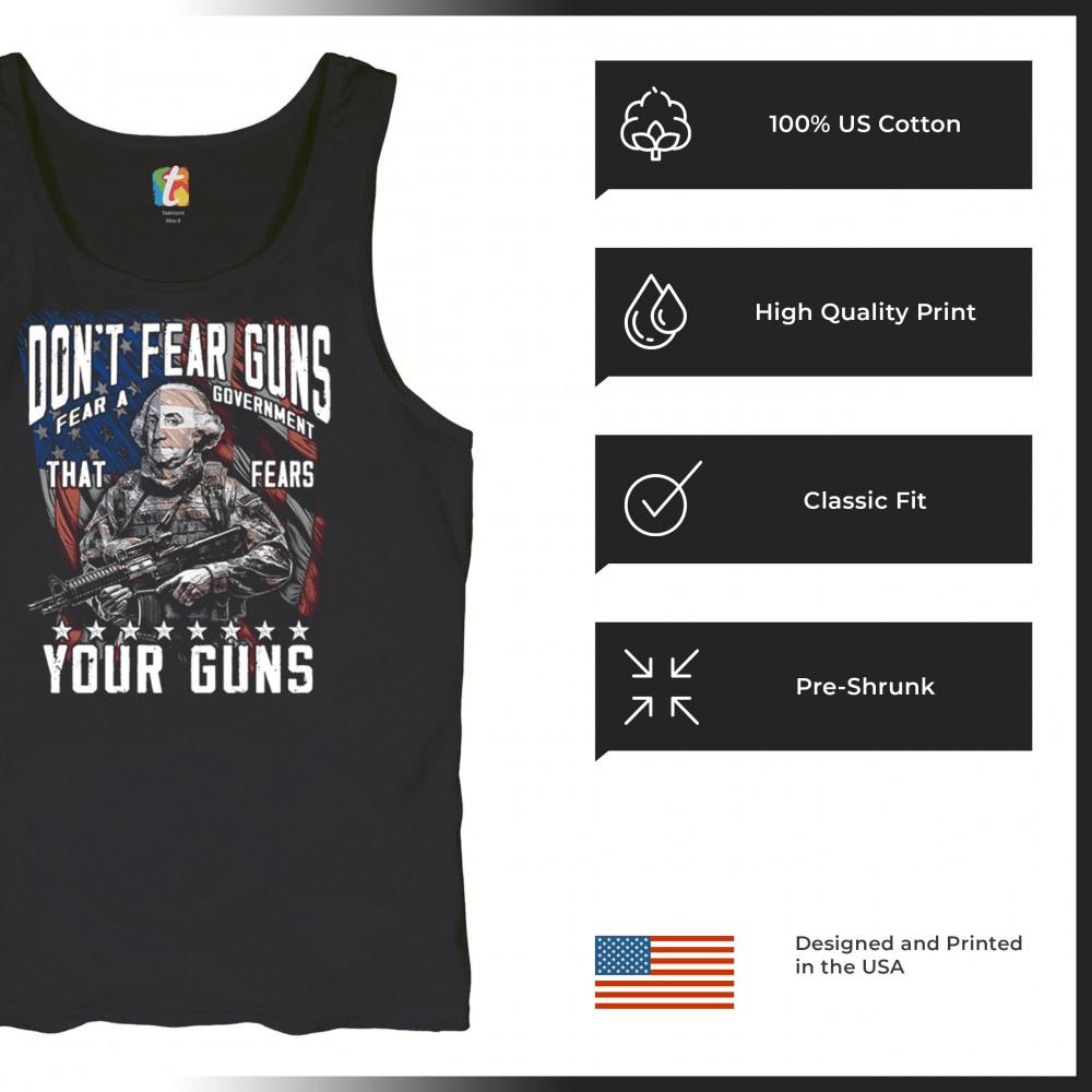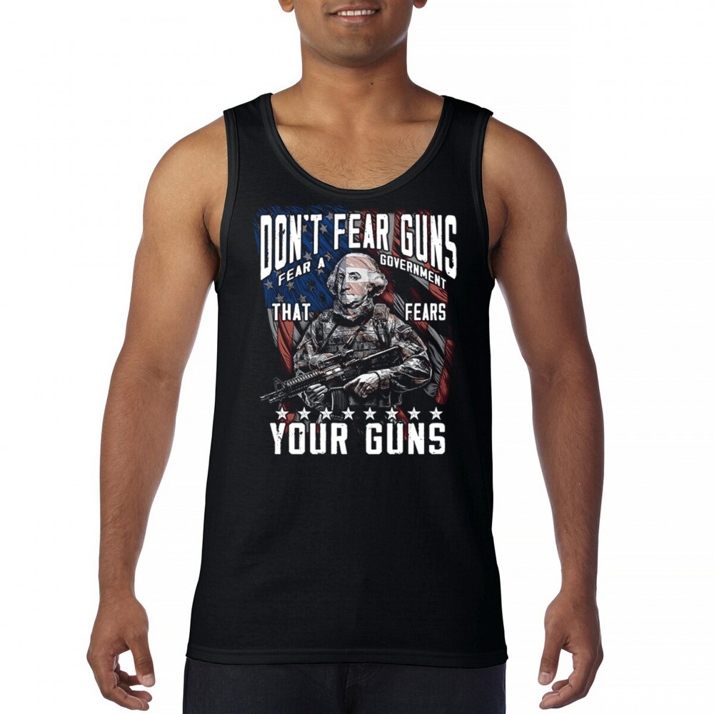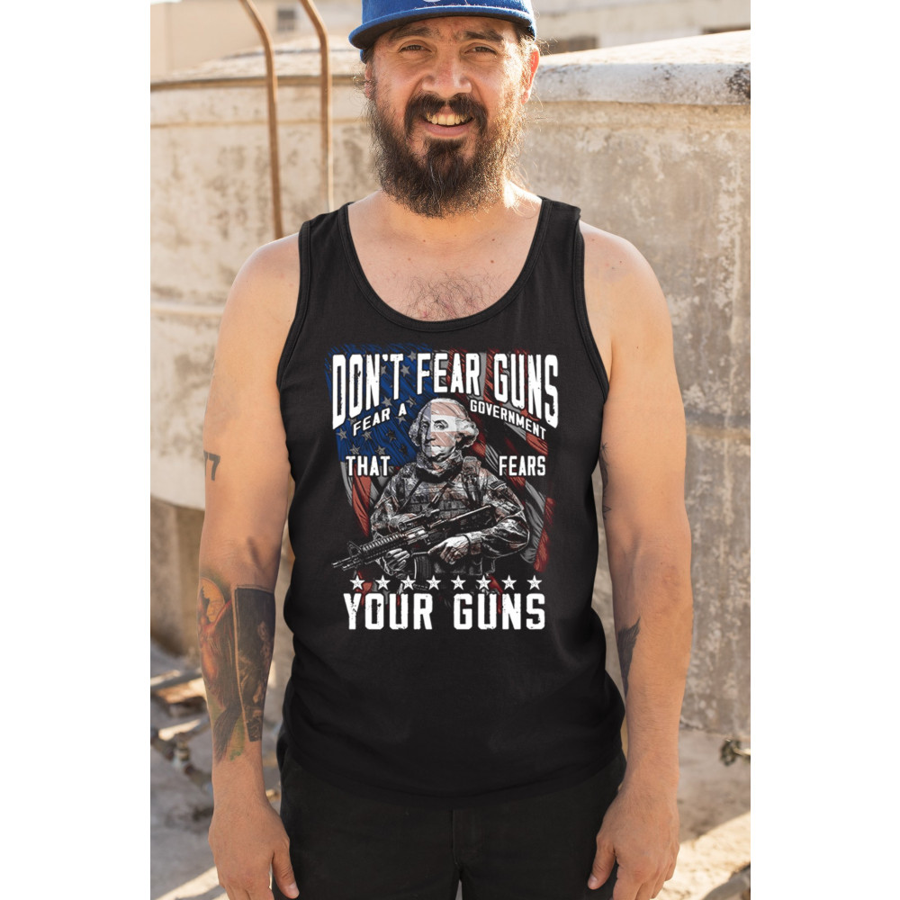 A fierce tribute to liberty, this design shows George Washington armed in tactical gear with the message "Don't Fear Guns, Fear a Government That Fears Your Guns." Perfect for 2nd Amendment patriots, protestors, and anyone who believes in self-defense and personal freedom. A bold, graphic statement for gun rights and political awareness.