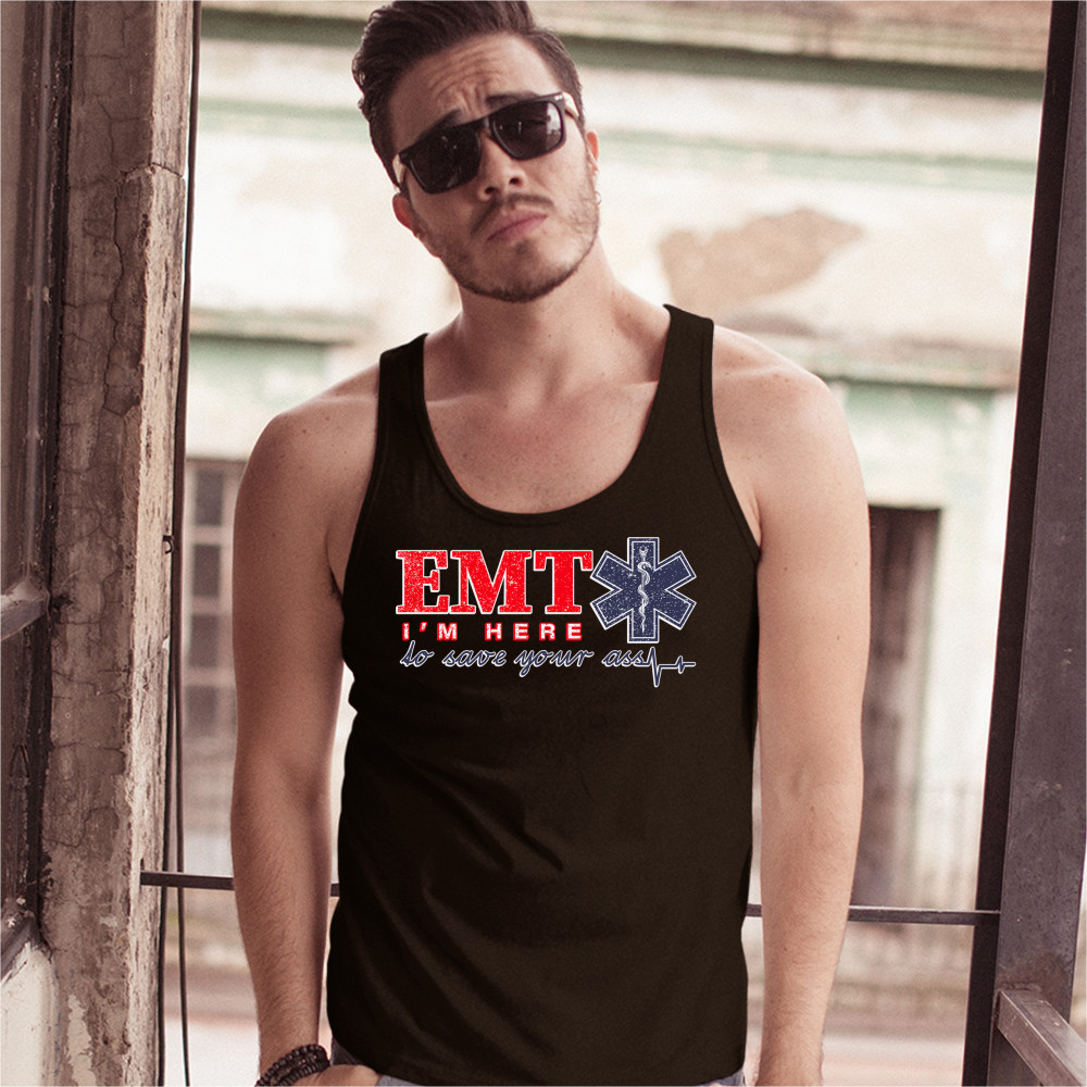 A funny print saying "EMT I'm Here to Save Your Ass". To the right of "EMT" there is the Star of Life, the worldwide recognized symbol of emergency medical services, with the Rod of Asclepius inside of it. A great choice as a gift for a first responder.